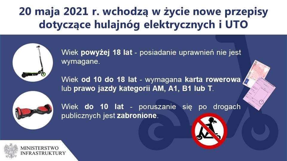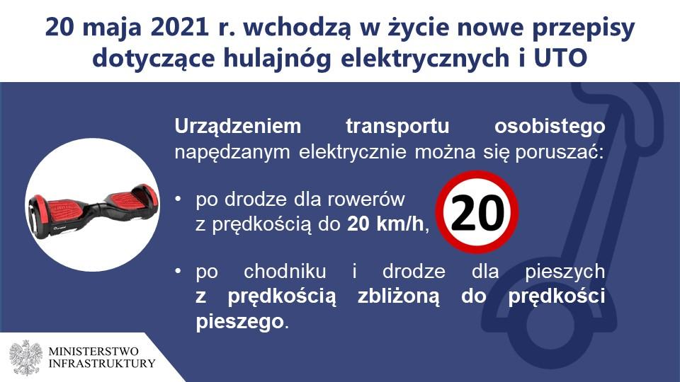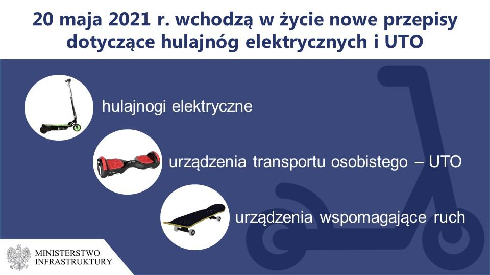 20 maja 2021 r. wejdą w życie przepisy nowelizacji ustawy Prawo o ruchu drogowym oraz niektórych innych ustaw, która reguluje status prawny urządzeń napędzanych elektrycznie oraz urządzeń napędzanych siłą mięśni przeznaczonych do poruszania się po drogach publicznych. Ustawa wprowadza pierwszeństwo pieszego w stosunku do kierującego hulajnogą elektryczną lub urządzeniem transportu osobistego (UTO) poruszającego się po części infrastruktury przeznaczonej dla ruchu pieszych. Kierujący tymi pojazdami będą zobowiązani do ustępowania pierwszeństwa pieszym i nieutrudniania im ruchu.