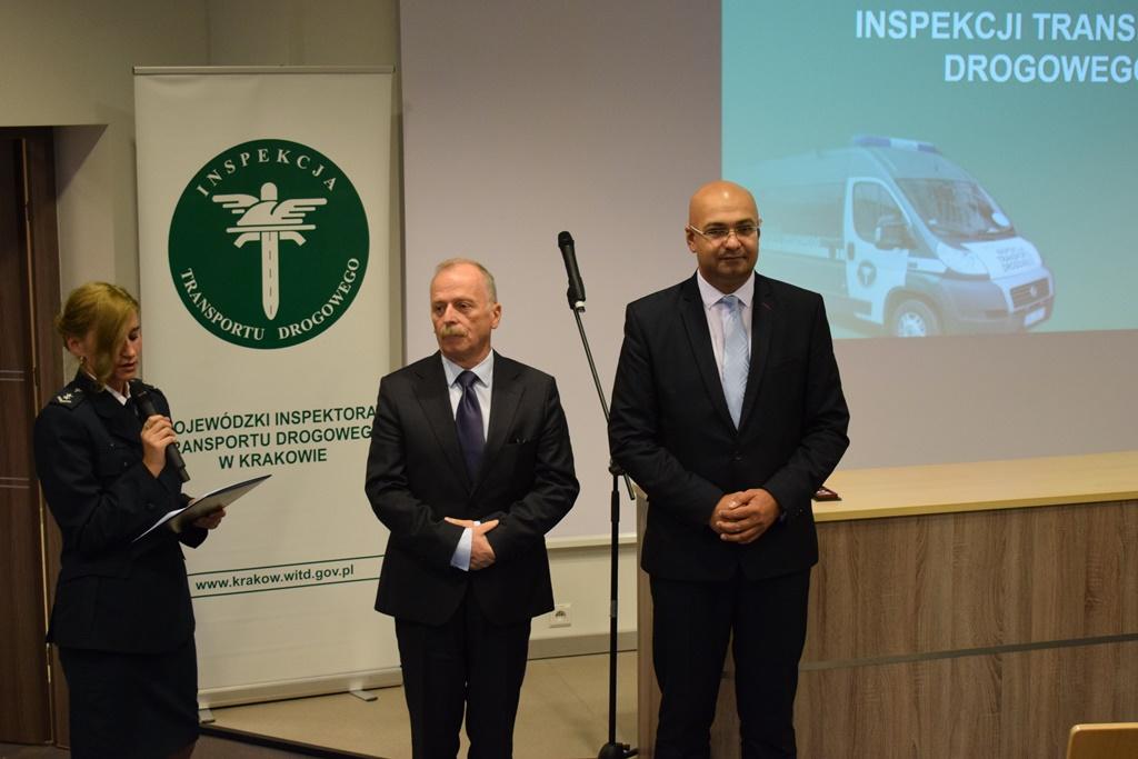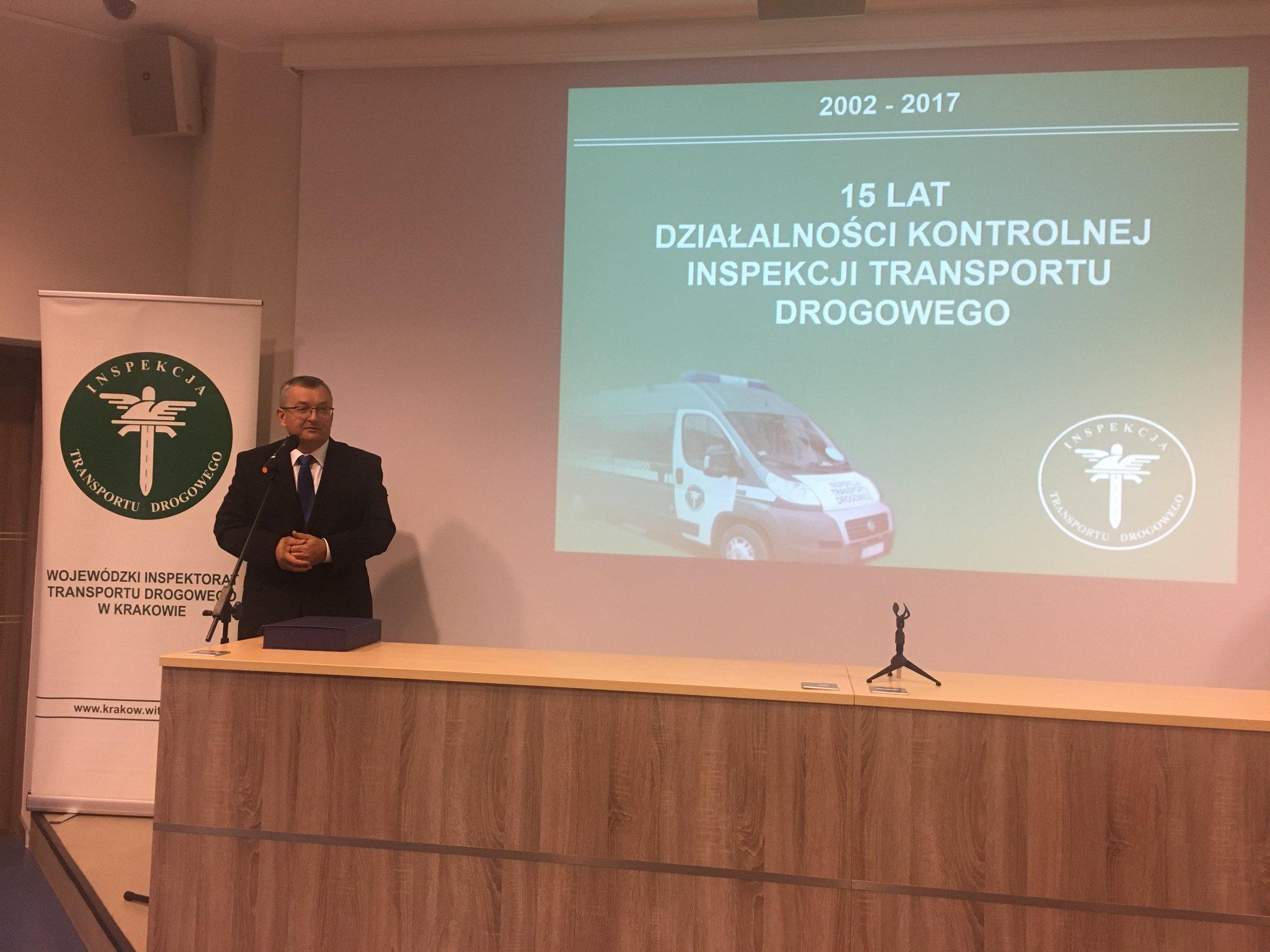 Minister Infrastruktury i Budownictwa Andrzej Adamczyk, Wiceminister Infrastruktury i Budownictwa Marek Chodkiewicz, Główny Inspektor Transportu Drogowego Alvin Gajadhur oraz przedstawiciele władz samorządowych i służb mundurowych wzięli udział w uroczystej konferencji zorganizowanej przez Wojewódzki Inspektorat Transportu Drogowego w Krakowie wraz z Delegaturą Południową i Sekcją zamiejscową Biura Elektronicznego Poboru Opłat Głównego Inspektoratu Transportu Drogowego z okazji 15-lecia działalności kontrolnej ITD.