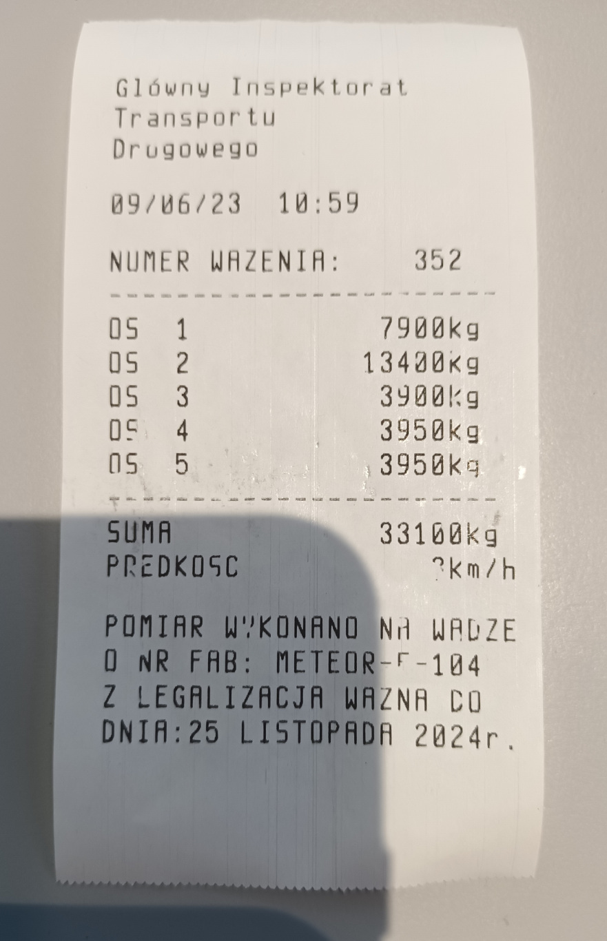 Inspektorzy skierowali kontrolowane pojazdy na przenośne wagi. W obu przypadkach stwierdzili to samo naruszenie przepisów prawa. Naciski osi napędowych obu ciężarówek wynosiły 13,4 t zamiast dozwolonych 11,5 t. Były zatem przekroczone o 1,9 t. To powoduje szybszą degradację nawierzchni jedni – powstawanie kolein i spękań oraz wpływa negatywnie na trwałość obiektów inżynieryjnych (przepustów/mostów).
