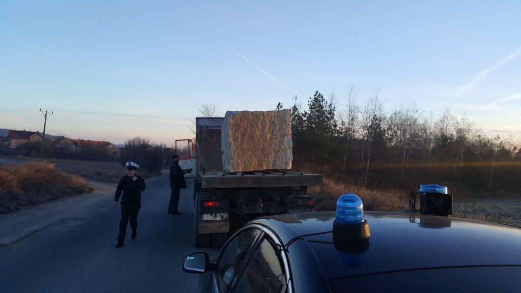 Jednym z kontrolowanych pojazdów kierowca przewoził ważący 8 ton blok granitu bez żadnego zabezpieczenia - kamień był położony na metalowej podłodze skrzyni ładunkowej.