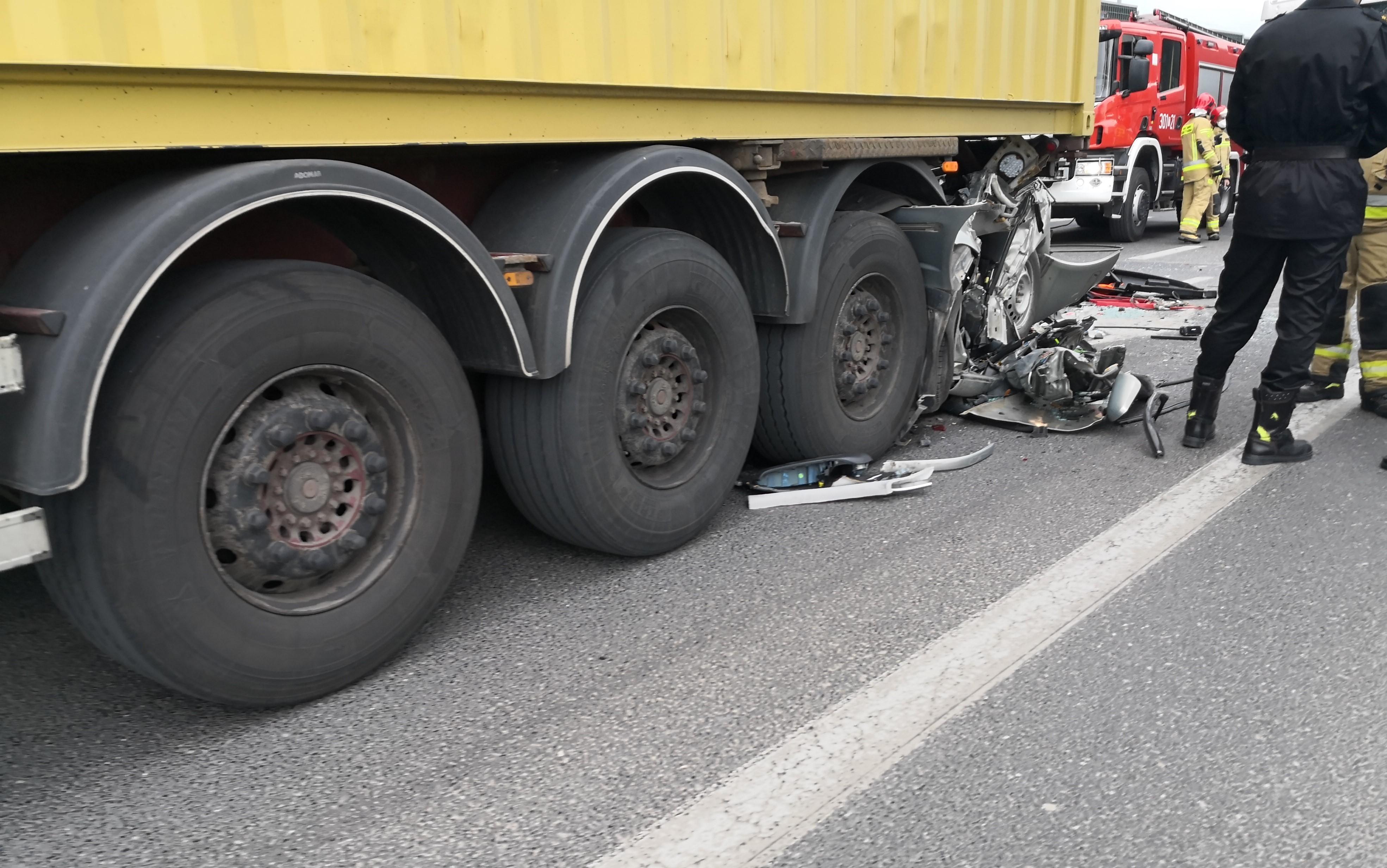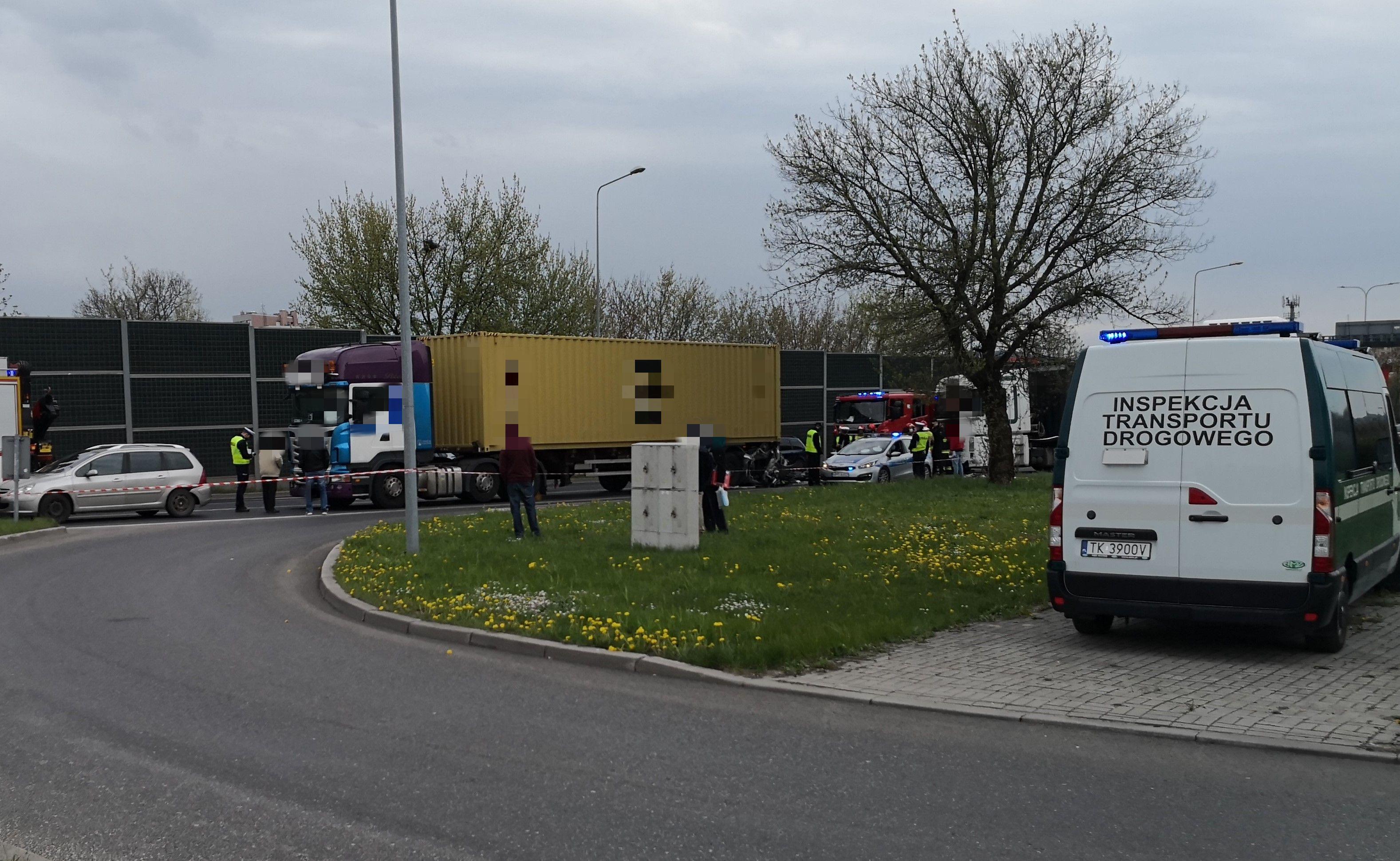 Funkcjonariusze świętokrzyskiej Inspekcji Transportu Drogowego pracowali na miejscu wypadku w centrum Kielc. Pijany kierowca ciężarówki uderzył w tył samochodu osobowego, wpychając go pod stojącą przed nim naczepę. Kierowca samochodu osobowego został uwolniony z wraku pojazdu i przewieziony do szpitala.