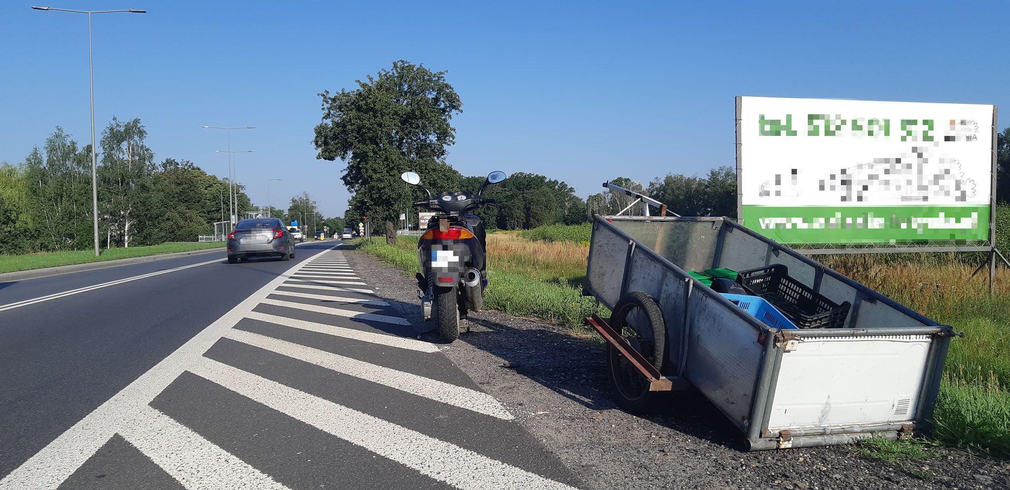 Kierowca pod wpływem alkoholu, a przyczepka w rowie. Do sadu po brzoskwinie skuterem jechało dwóch mężczyzn. W trakcie jazdy prowizorycznie sprzężona z pojazdem przyczepa wypięła się i wpadła do przydrożnego rowu. Interweniowali wrocławscy Inspektorzy Transportu Drogowego.