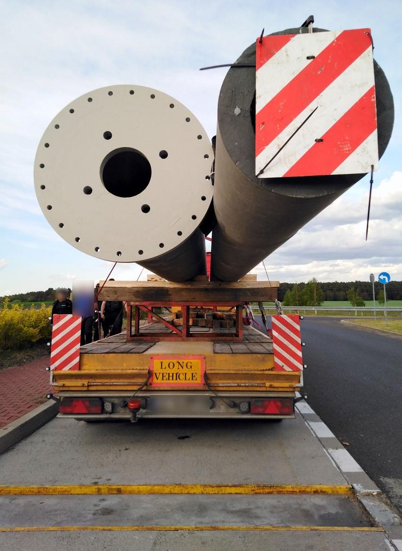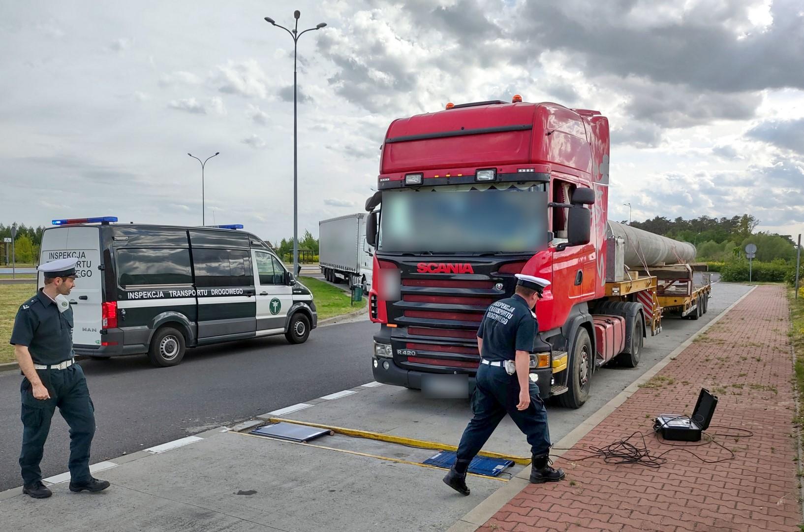 Patrol inspektorów Inspekcji Transportu Drogowego z Gniezna, w piątek na wschodniej obwodnicy Poznania (S5), zatrzymał zespół pojazdów polskiego przewoźnika. Na naczepie znajdowały się dwa słupy betonowe. Ich długość - 23 m, była o 6,5 m większa od normy. Z kolei rzeczywista masa całkowita, przy normie 40 t, wyniosła 43,3 t. Przekroczony był też dopuszczalny nacisk pojedynczej osi napędowej w ciągniku siodłowym. Kierowca nie posiadał przy sobie zezwolenia na przejazd pojazdu nienormatywnego. Nie miał również żadnego dokumentu tożsamości. Okazało się, że był on poszukiwany przez organy ścigania do odbycia kary pozbawienia wolności. Na miejsce został wezwany patrol policji. Kierowcę aresztowano. Przedsiębiorcy grozi w postępowaniu administracyjnym kara pieniężna w wysokości 28 tys. zł. Odpowiedzialności nie uniknie też zarządzający transportem w firmie. Zespół pojazdów został usunięty na parking strzeżony.