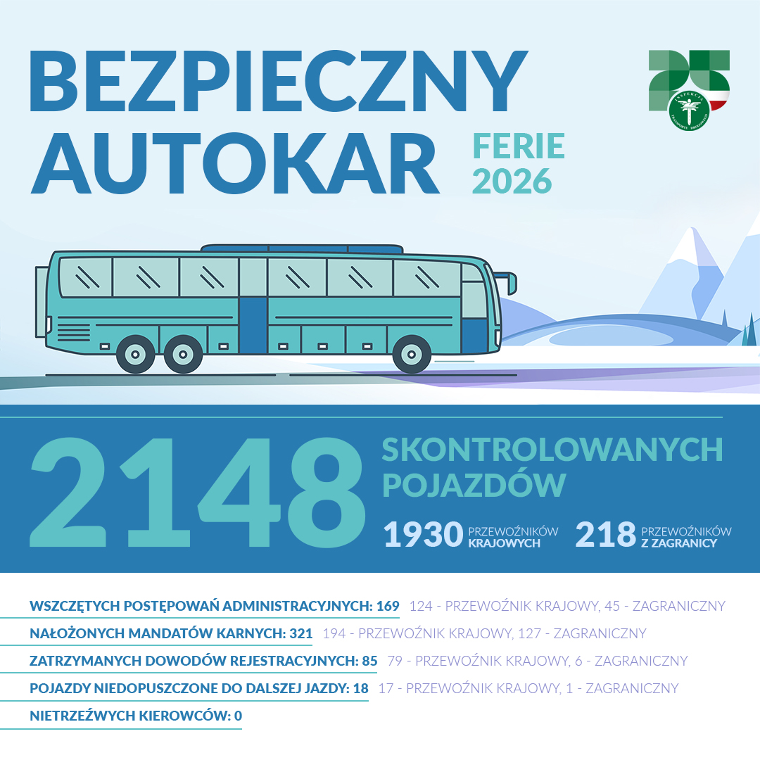 Choć ferie zimowe dobiegły końca, możliwość skontrolowania autokaru nie ogranicza się wyłącznie do czasu trwania akcji. W każdej chwili można zwrócić się do właściwego miejscowo Wojewódzkiego Inspektoratu Transportu Drogowego z wnioskiem o przeprowadzenie kontroli autokaru realizującego wyjazd zorganizowany. Zgłoszenia należy przekazywać z kilkudniowym wyprzedzeniem – telefonicznie lub drogą mailową – podając datę, godzinę i miejsce wyjazdu oraz dane przewoźnika. Dane kontaktowe do wszystkich Wojewódzkich Inspektoratów Transportu Drogowego dostępne są na stronie internetowej https://www.gov.pl/web/gitd/witd.