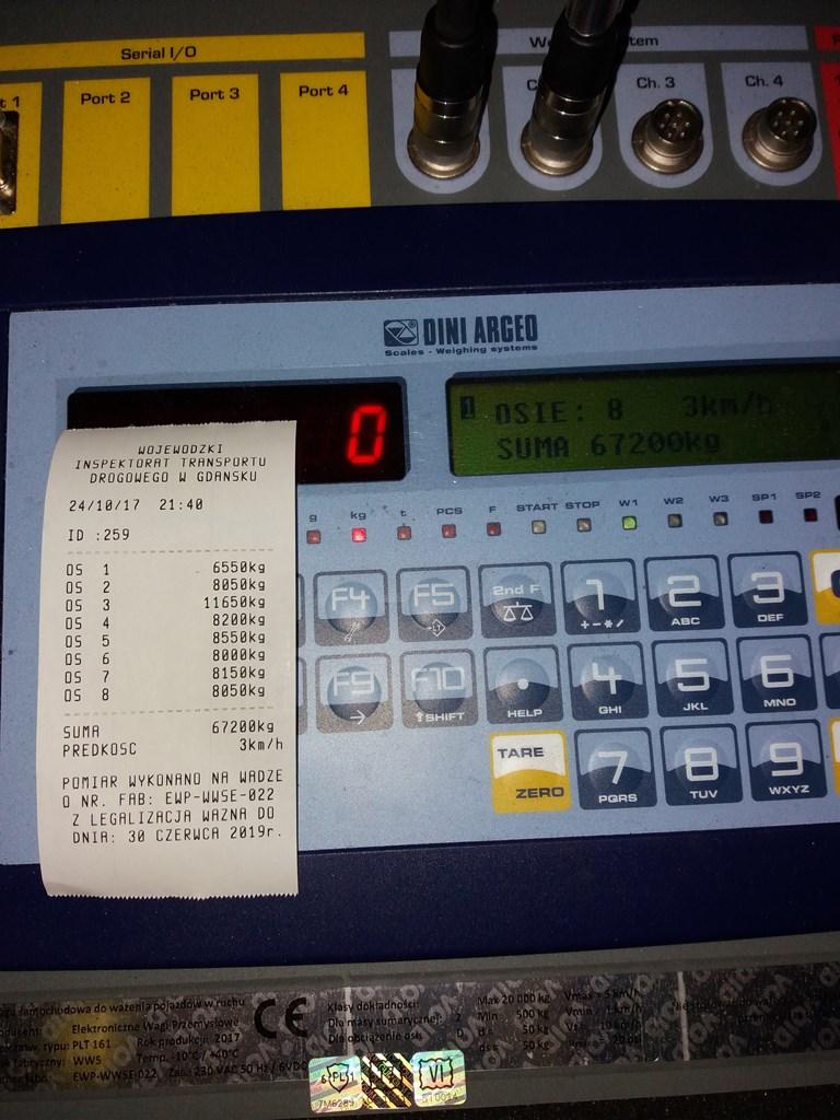 Okazało się, że każdego dnia zatrzymywano przeciążone pojazdy. Jednym z nich przewożono w dwóch kontenerach 20-stopowych granulat z Gdyni do Aleksandrowa Kujawskiego. Kierowca początkowo nie okazał dokumentu powozowego, jednak od razu przyznał, że prawdopodobnie ma więcej ładunku niż pozwalają na to przepisy. Według kierującego mogło być to maksymalnie 10 ton więcej. Ważenie wykazało, że przekroczenie dopuszczalnej masy całkowitej jest znacznie większe niż początkowo utrzymywał kierowca - całkowita masa wyniosła aż 67 ton. Nienormatywne okazały się także naciski poszczególnych osi oraz zespół osi - nacisk potrójnej osi naczepy wyniósł 30,6 tony. Również w dwóch innych przypadkach stwierdzono rzeczywistą masę całkowitą ponad 60 ton.