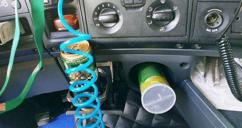 Inspektorzy zatrzymali ciężarówkę i skierowali do pobliskiego punktu ważenia pojazdów, gdzie mogli bezpiecznie przeprowadzić kontrolę drogową. W trakcie wykonywania wydruku z tachografu będącego w pojeździe jeden z inspektorów poczuł od kierującego zapach alkoholu i zauważył w kabinie otwartą puszkę z piwem. Badanie trzeźwości urządzeniem AlcBlow potwierdziło obecność alkoholu w powietrzu wydychanym przez kierowcę.