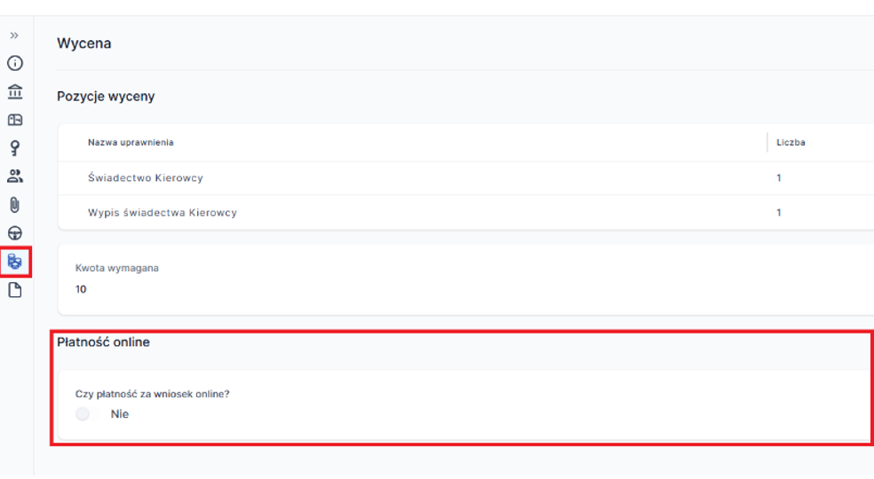 Możliwość zapłacenia za wniosek online poprzez płatność elektroniczną jest opcją domyślnie włączoną dla każdego wniosku, który składają Państwo na Portalu Klienta. Wybór sposobu płatności znajduje się w zakładce „Wycena” i można ją zmienić w dowolnym momencie przed złożeniem wniosku do urzędu przesuwając suwak o nazwie „Czy płatność za wniosek online?” na pozycję „nie” tak, jak to wskazano na obrazku poniżej.