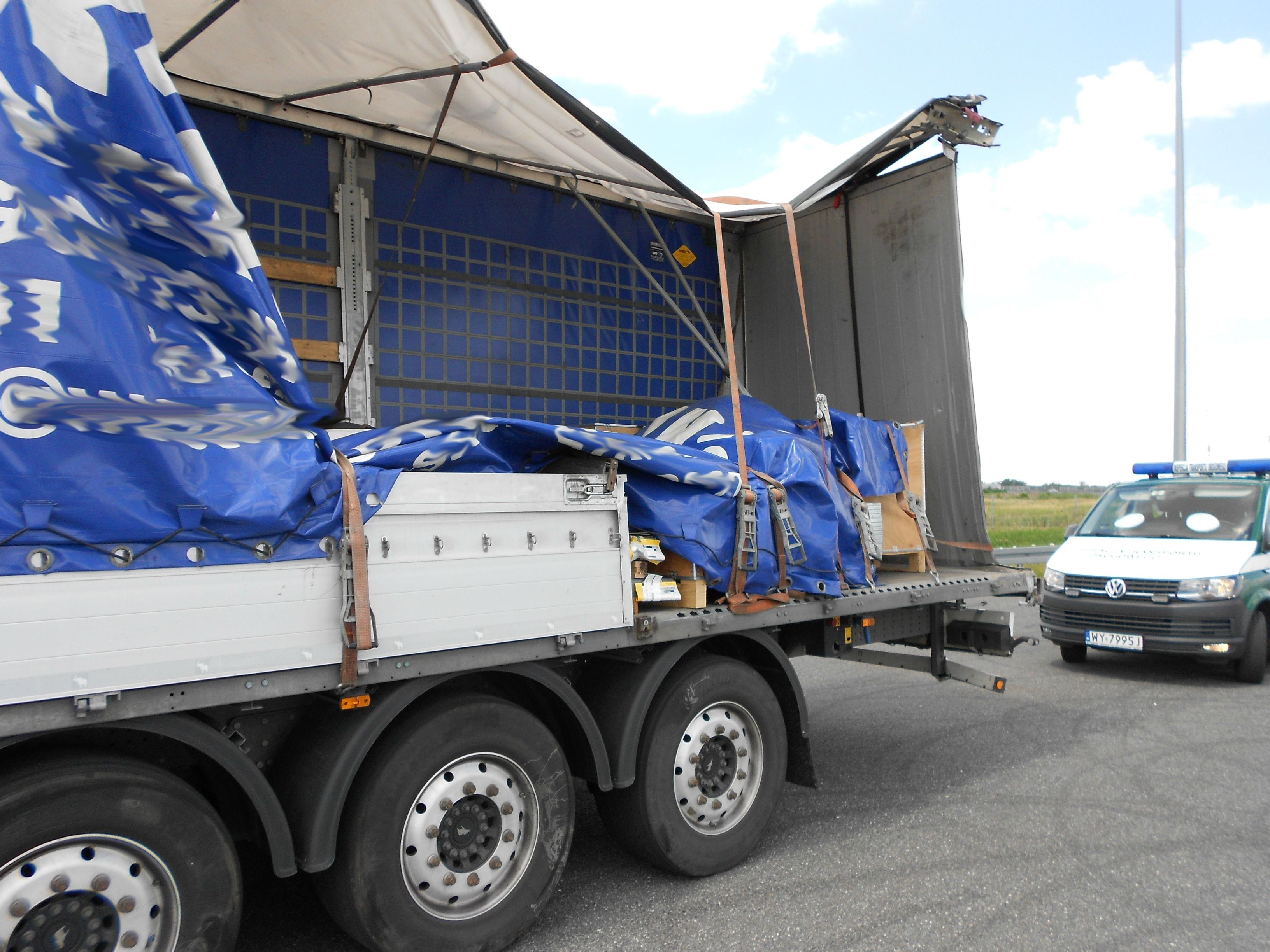 Ciężarówka stwarzała poważne zagrożenie w ruchu drogowym. Przewożony ładunek mógł wypaść w każdym momencie. Inspektorzy zakazali dalszej jazdy. Kontrolujący zatrzymali też dowód rejestracyjny zniszczonej naczepy, a kierowcę ukarali mandatem karnym.