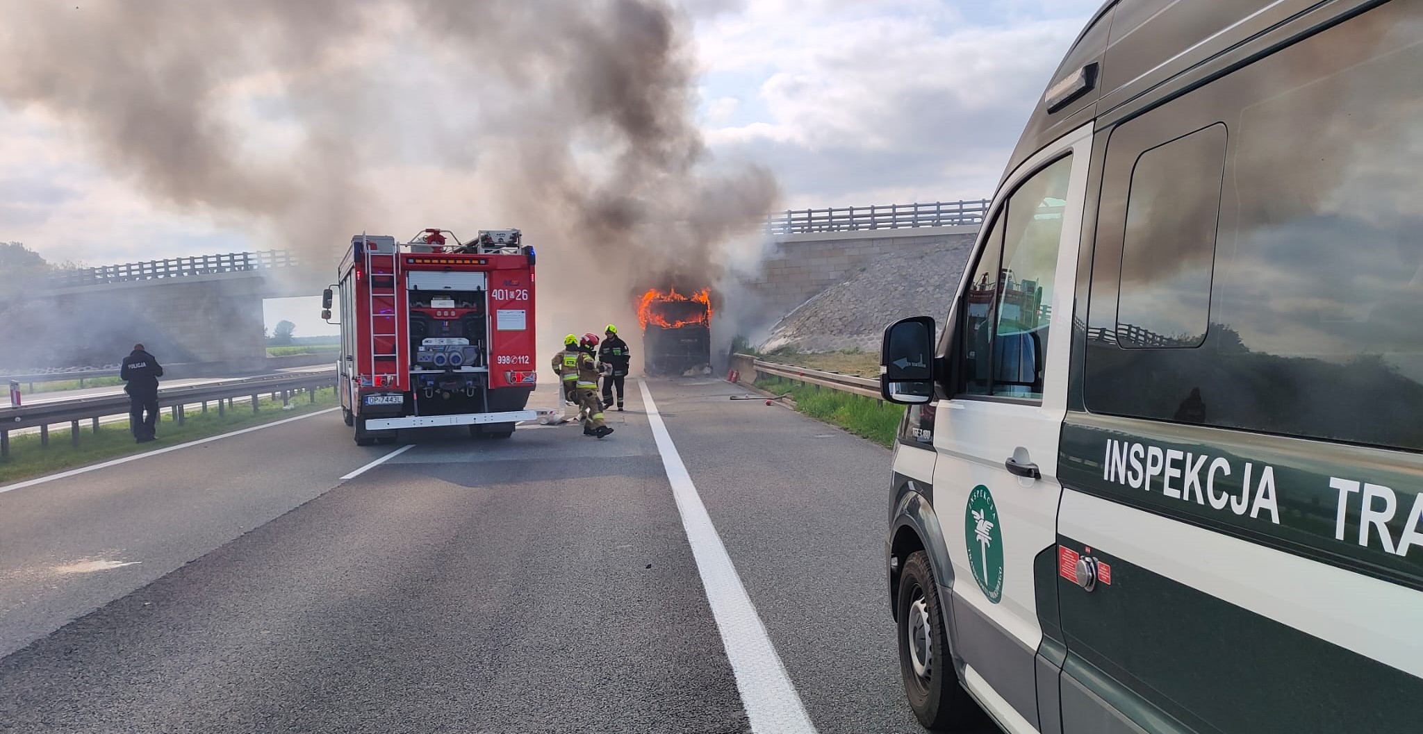 Inspektorzy opolskiej Inspekcji Transportu Drogowego zabezpieczyli miejsce zdarzenia, wezwali służby ratunkowe i przystąpili do próby ugaszenia płonącego autobusu na autostradzie A4 koło Brzegu. Kierowca, młodzi pasażerowie oraz ich opiekunowie w porę opuścili pojazd. Inspektorzy pomagali w akcji gaśniczej do końca prowadzonych działań.