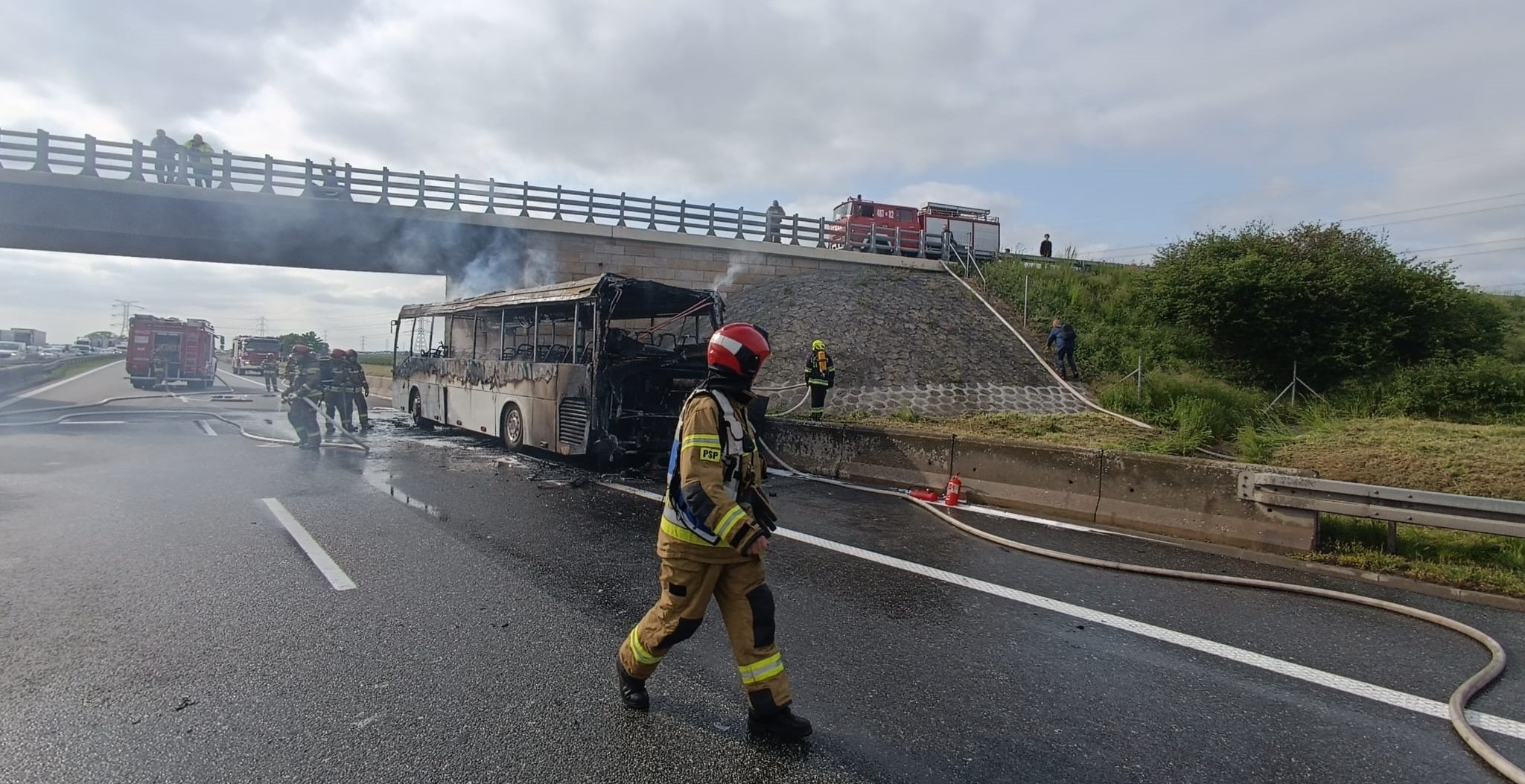Pożar autokaru na A4. Inspektorzy pomagali w akcji