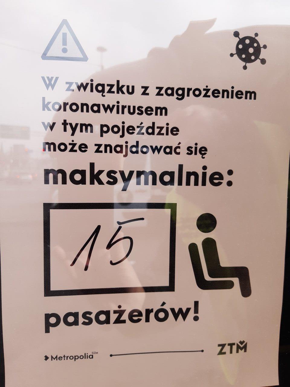Środkami publicznego transportu zbiorowego w tym samym czasie może podróżować nie więcej osób niż połowa liczby miejsc siedzących. Ograniczenie mające zapobiegać rozprzestrzenianiu się koronawirusa zostało wprowadzone rozporządzeniem Ministra Zdrowia z dnia 24 marca 2020 r. zmieniającym rozporządzenie w sprawie ogłoszenia na obszarze Rzeczypospolitej Polskiej stanu epidemii.