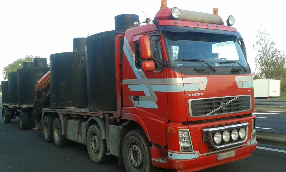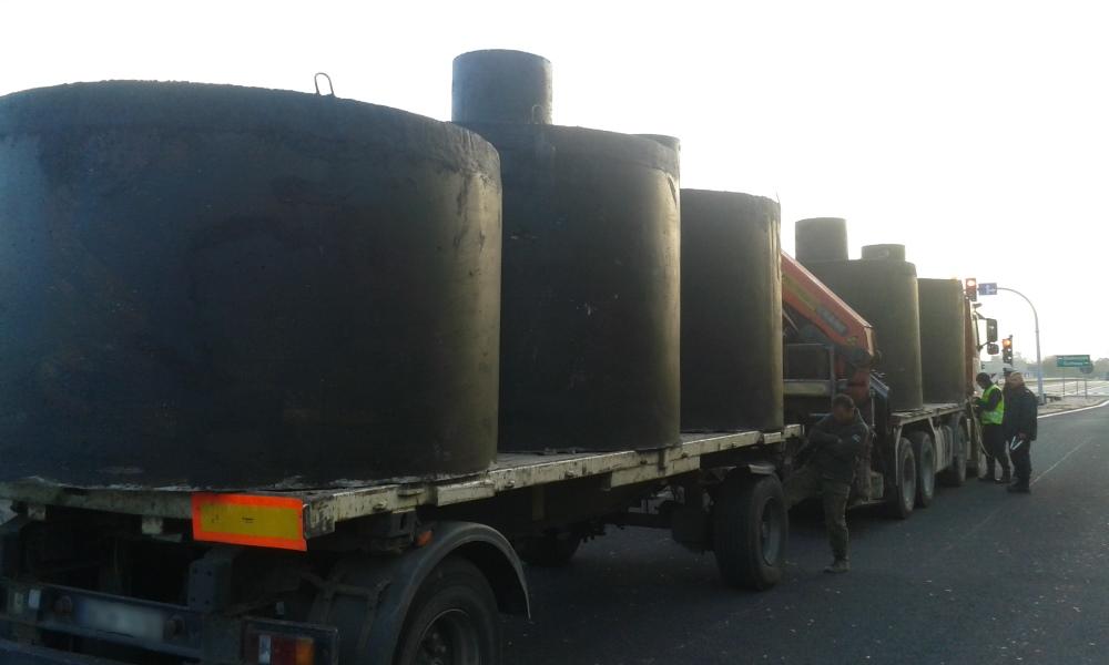 W dniu 12 października inspektorzy z Wojewódzkiego Inspektoratu Transportu Drogowego w Poznaniu wykonując czynności kontrolne w miejscowości Kostrzyn Wielkopolski, na drodze krajowej nr 92 zatrzymali do kontroli samochód ciężarowy z przyczepą. Z uwagi na podejrzenie, iż pojazd może być przeładowany został on doprowadzony do legalizowanego punktu kontroli pojazdów ciężarowych znajdującego się w miejscowości Siedlec przy drodze krajowej nr 92. Kierowca będący jednocześnie przedsiębiorcą wykonywał krajowy niezarobkowy przewóz drogowy rzeczy z niezabezpieczonym w żaden sposób ładunkiem zbiorników betonowych w ilości pięciu sztuk. Ważenie pojazdu wykazało, iż rzeczywista masa całkowita pojazdu z ładunkiem wyniosła 54,22 t, zatem przekraczała wartość dopuszczalną o 14,22 t (przekroczenie o 35,55%). Ponadto, nacisk na podwójną oś napędową (oś trzecia i czwarta) przy odległości 1,39 m wyniósł 23,09 t, zatem przekraczał wartość dopuszczalną o 5,09 t (przekroczenie o 28,27%). Z uwagi na brak wymaganego zezwolenia na przejazd pojazdu nienormatywnego, wobec przedsiębiorcy wszczęto postępowanie administracyjne zagrożone karą pieniężną w wysokości 15.000,00 zł. W toku dalszych czynności kontrolnych inspektorzy ujawnili również, iż kierowca wykonujący przewóz nie posiadał wymaganego orzeczenia o braku przeciwskazań zdrowotnych i psychologicznych do wykonywania pracy na stanowisku kierowcy oraz nie ukończył wymaganego szkolenia okresowego. Kierowca będący jednocześnie przedsiębiorcą został ukarany mandatami karnymi w łącznej wysokości 3.000,00 zł. Dodatkowo po sprawdzeniu danych cyfrowych zapisanych na karcie kierowcy, stwierdzono liczne naruszenia z zakresu czasu pracy kierowcy, co skutkowało wszczęciem wobec przedsiębiorcy postępowania administracyjnego zagrożonego karą pieniężną w wysokości 3.350,00 zł.