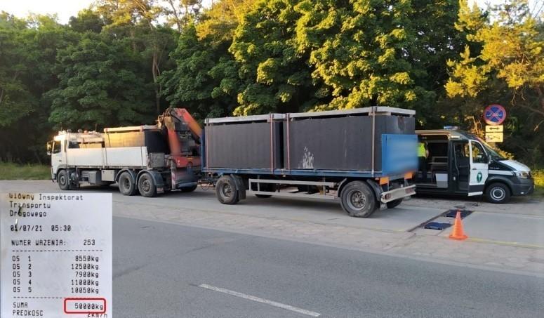Samochód ciężarowy z przyczepą i ładunkiem ważył 50 ton zamiast dopuszczalnych 40 ton. Za duża masa ładunku spowodowała też przekroczenie dozwolonych nacisków osi samochodu ciężarowego oraz przyczepy na drogę, co wpływa negatywnie na stan nawierzchni dróg – powstawanie kolein i spękań.