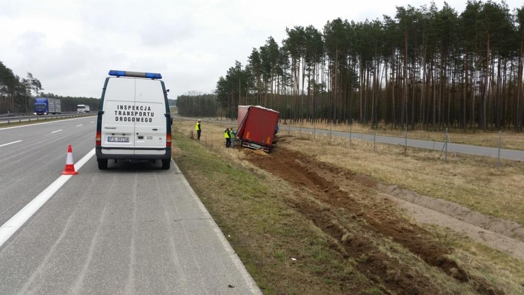 W dniu 8 kwietnia funkcjonariusze Posterunku Policji Autostradowej Wojewódzkiej Komendy Policji w Gorzowie Wielkopolskim zwrócili się do inspektorów z Lubuskiego Wojewódzkiego Inspektoratu Transportu Drogowego o pomoc przy ustaleniu przyczyn wypadnięcia z drogi pojazdu członowego na lubuskim odcinku autostrady A2. Po przybyciu na miejsce, inspektorzy zastali zestaw pojazdów składający się z ciągnika siodłowego oraz naczepy. Kierujący z nieustalonych przyczyn zjechał na pobocze i ugrzązł, nie odnosząc przy tym żadnych obrażeń. Kontrola wykazała, iż wykonując międzynarodowy przewóz rzeczy kierowca przewoził z Niemiec do Polski 26 ton papieru w belach. Ponadto, analiza zapisów tachografu analogowego ujawniła, iż w dniu poprzedzającym okres jazdy kierowca z minimalnego 9 godzinnego dziennego odpoczynku wykonał jedynie 6 godzin, skracając w ten sposób odpoczynek dobowy o 3 godziny. Zapisy na wykresówce wykazały również, iż przed zdarzeniem kierowca zwalniał do około 40 km/h, po czym nabierał prędkości. Kierujący przyznał się, iż w chwili wypadnięcia z drogi zasnął. Na kierującego został nałożony mandat karny, a dalsze czynności przeprowadzili funkcjonariusze Policji.