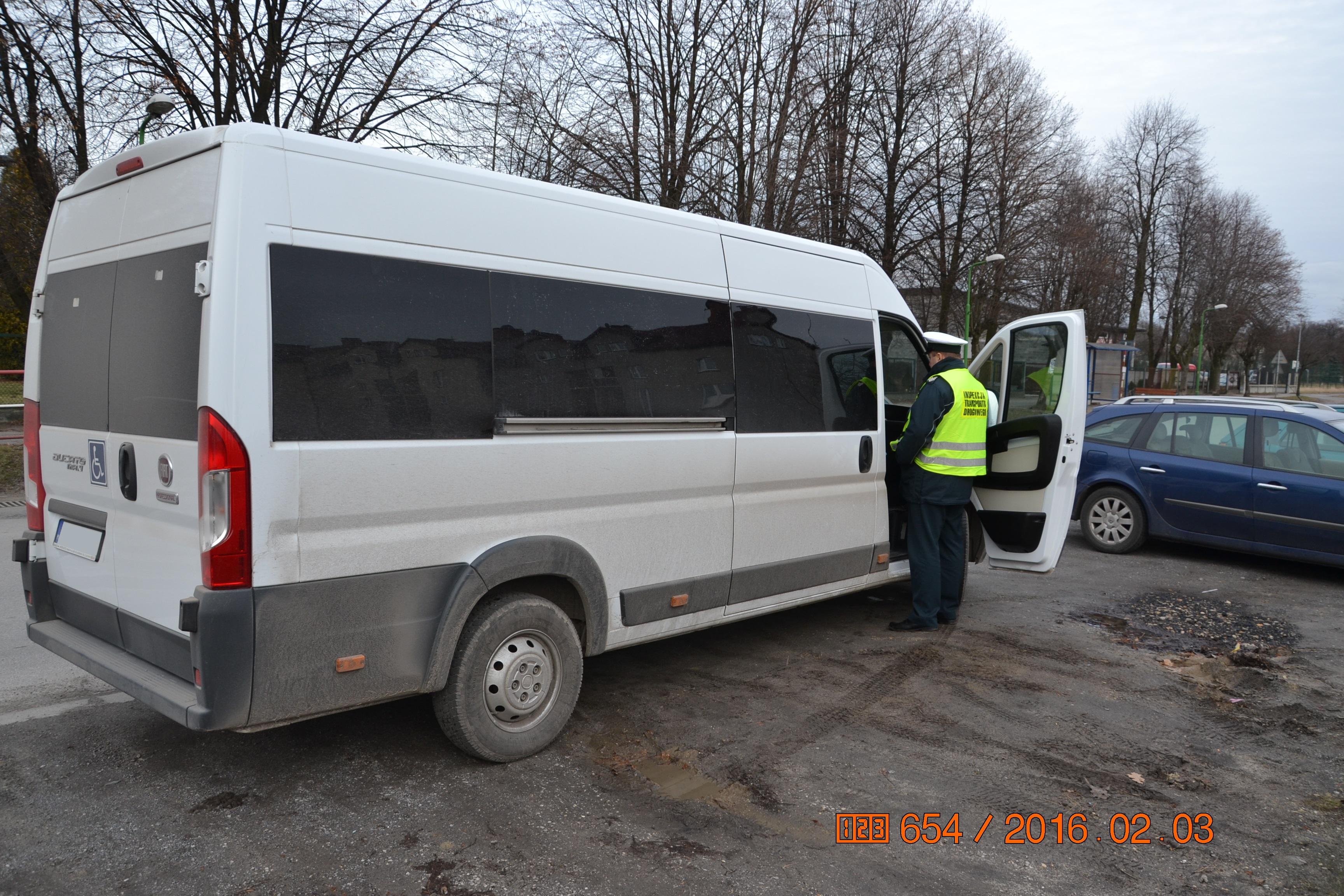 W dniu 3 lutego inspektorzy z Wojewódzkiego Inspektoratu Transportu Drogowego w Katowicach zostali poproszeni przez Policję o przeprowadzenie kontroli drogowej krajowego przewoźnika, który wykonywał przewóz dzieci niepełnosprawnych z Wolbromia do Szczekocin. Podczas kontroli, która odbyła się w Szczekocinach inspektorzy stwierdzili, iż przedsiębiorca wykonuje przewóz osób pojazdem samochodowym przeznaczonym konstrukcyjnie do przewozu powyżej 7 i nie więcej niż 9 osób łącznie z kierowcą bez wymaganej licencji. Brak licencji oznacza, że przedsiębiorca nie tylko nie posiada uprawnień, ale także, że nie został on zweryfikowany przez starostę pod kątem niekaralności, posiadania kompetencji zawodowych czy wymaganego zabezpieczenia finansowego, co między innymi jest nieodzowne przy ubieganiu się o licencję. Inspektorzy wszczęli wobec przedsiębiorcy postępowanie administracyjne w przedmiocie wykonywania transportu drogowego bez wymaganych uprawnień, co jest zagrożone karą w wysokości 8 tysięcy złotych. Kierowcę ukarano mandatem w kwocie 200 zł za brak oznaczenia pojazdu tablicami "dzieci" oraz 500 zł za brak wymaganego dokumentu.