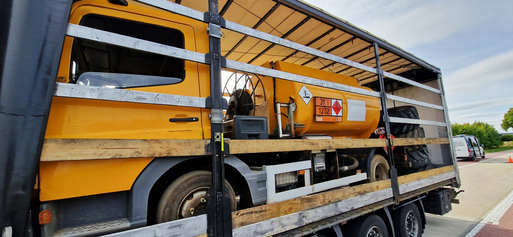 Dzień wcześniej naruszenie przepisów z zakresu przewozu towarów niebezpiecznych stwierdzili lubuscy inspektorzy. W Wilkowie, na drodze krajowej nr 92, zatrzymali do kontroli zespół pojazdów ukraińskiego przewoźnika, jadący z Wielkiej Brytanii do Ukrainy. W naczepie należącej do zestawu przewożono ciągnik siodłowy oraz ciężarówkę-cysternę. Oznakowanie cysterny wskazywało na przewóz paliwa. Kierowca nie okazał do kontroli dokumentu potwierdzającego oczyszczenie cysterny z resztek substancji niebezpiecznych, a na dnie cysterny znajdowała się ciecz, przypominająca wyglądem i zapachem olej napędowy. Tego typu transport podlega pod przepisy dotyczące przewozu drogowego towarów niebezpiecznych. Tym samym wymagana jest dokumentacja przewozu i niezbędne jest odpowiednie wyposażenie pojazdu oraz oznakowanie go tablicami barwy pomarańczowej. Tego zabrakło. Poza tym, pojazd przewożony w naczepie nie był zabezpieczony do transportu. Inspektorzy mieli też zastrzeżenia do czasu pracy kierowcy i obsługi tachografu.
