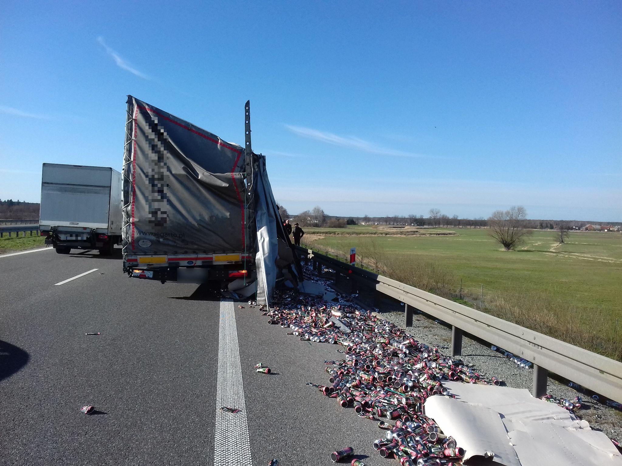 Setki puszek po piwie rozsypały się na ekspresowej „piątce” po zderzeniu dwóch ciężarówek.