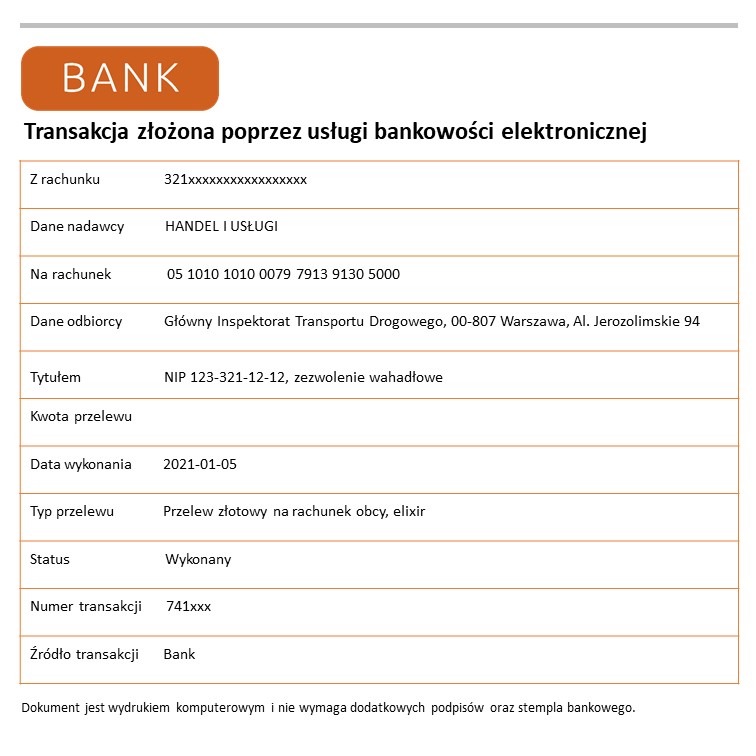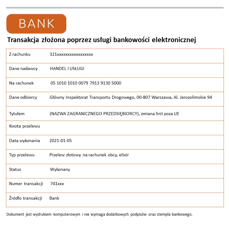 W tytule przelewu należy bezwzględnie podać NIP przedsiębiorcy i wskazać czego dot. opłata np. linia UE w relacji ….
