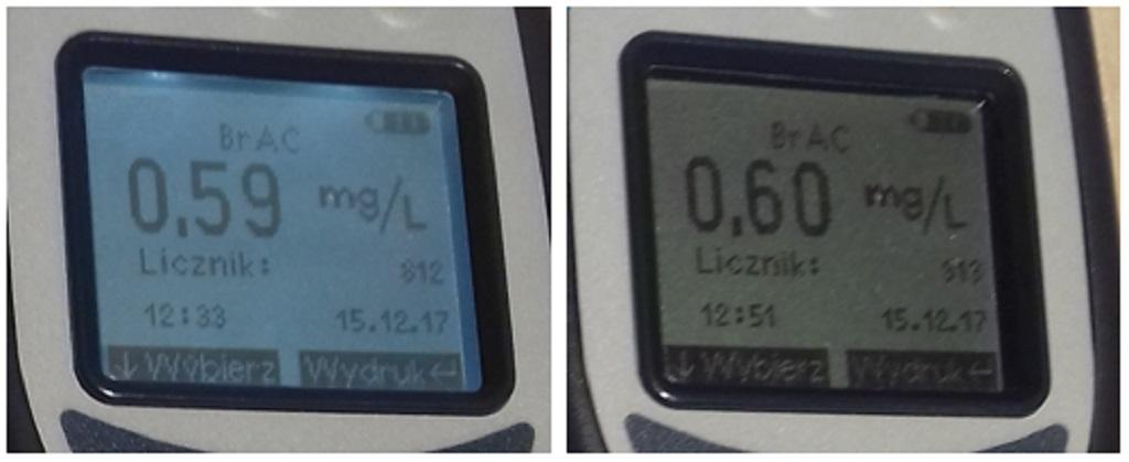 Inspektorzy wezwali na miejsce kontroli patrol Policji, który dokonał kolejnego badania stanu trzeźwości kierującego. Wówczas zawartość alkoholu w wydychanym powietrzu przez kierowcę wynosiła 0,72 mg/l (ok. 1,5 promila). Policjanci zatrzymali kierującego w celu przeprowadzenia dalszych czynności.