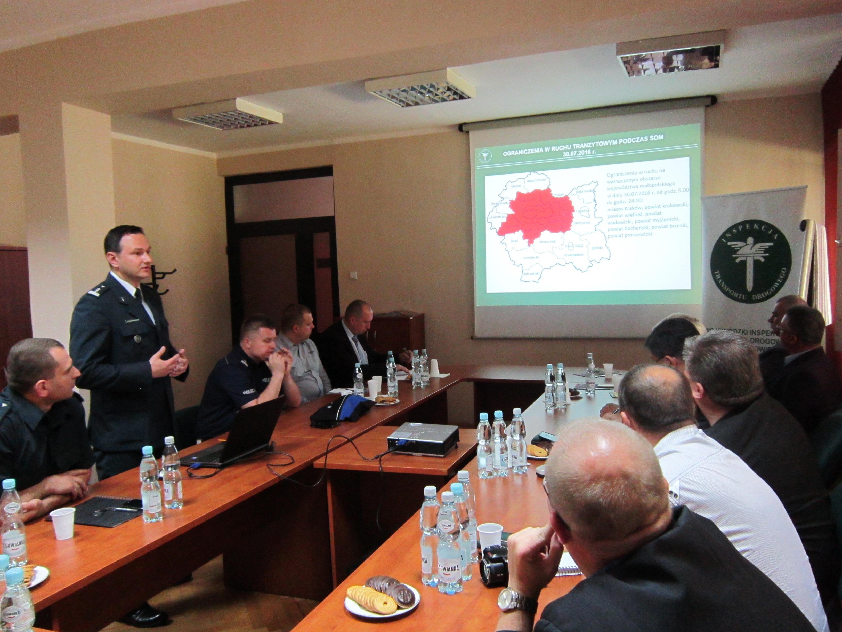 W dniu 1 czerwca w siedzibie Wojewódzkiego Inspektoratu Transportu Drogowego w Krakowie, podobnie jak w latach poprzednich odbyło się posiedzenie Społecznej Rady Konsultacyjnej przy Małopolskim Wojewódzkim Inspektorze Transportu Drogowego. W spotkaniu uczestniczyli przedstawiciele Strony Społecznej tj.: Ogólnopolskiego Związku Pracodawców Transportu Drogowego, Ogólnopolskiego Stowarzyszenia Przewoźników Drogowych "Galicja", Krakowskiej Izby Turystyki, Sądeckiej Izby Gospodarczej, Komendy Wojewódzkiej Policji Wydziału Ruchu Drogowego oraz Karpackiego oddziału Straży Granicznej w Nowym Sączu. Ze strony inspekcji w spotkaniu uczestniczyli także naczelnicy Wydziału Inspekcji oraz p.o. Zastępca Naczelnika Delegatury Południowej GITD. Spotkanie poświęcono przede wszystkim omówieniu zmian w organizacji ruchu w związku z obchodami Światowych Dni Młodzieży Kraków 2016. Ponadto, przedstawiono wyniki kontroli w zakresie nieprawidłowości podczas wykonywania międzynarodowego transportu drogowego. Uwagę poświęcono również tematom zgłaszanym przez przedstawicieli Strony Społecznej, tj. kontrolom zezwoleń międzynarodowych oraz pojazdów o dopuszczalnej masie całkowitej do 3,5 t.