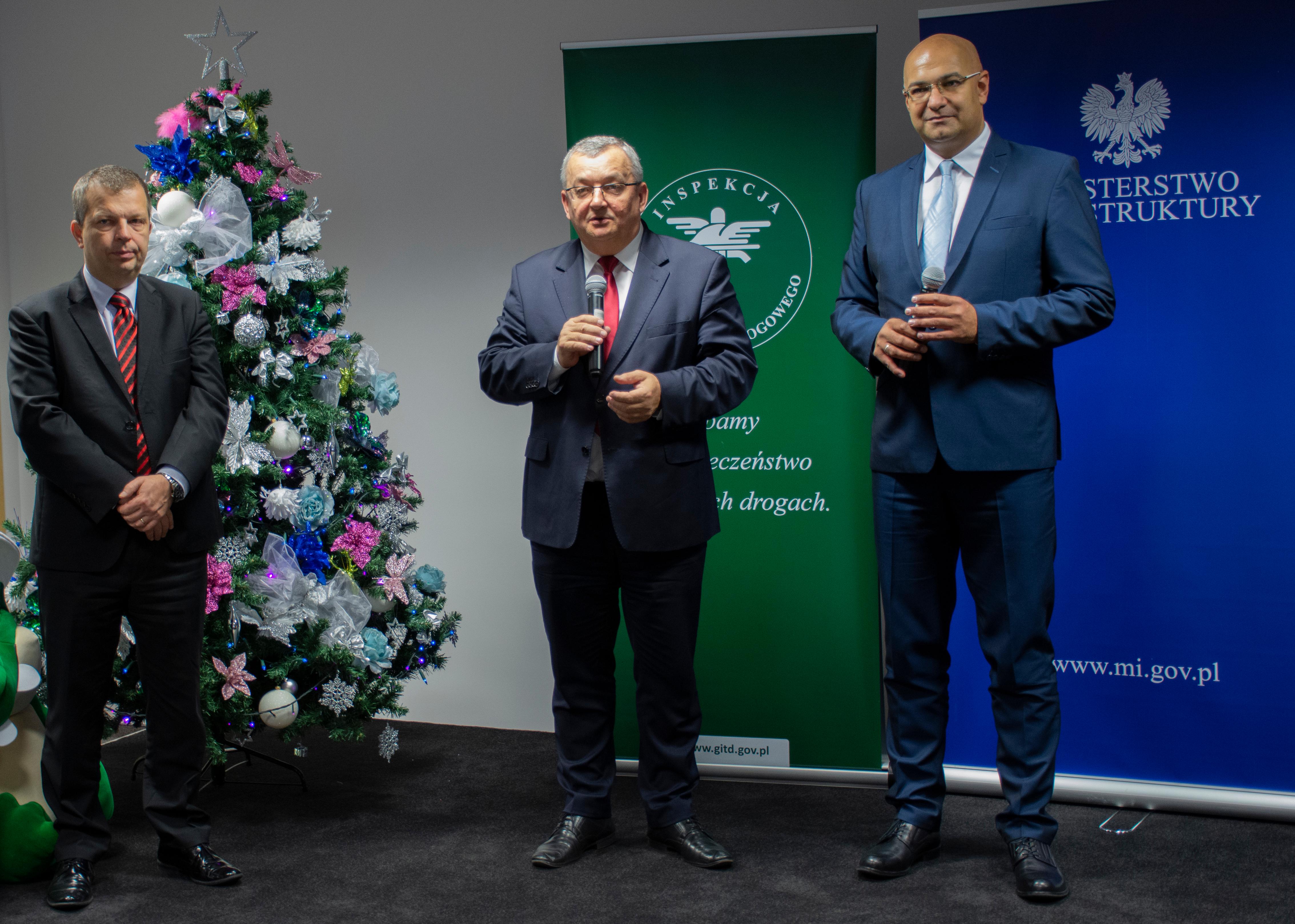 Tradycyjne spotkanie świąteczne z udziałem Ministra Infrastruktury Andrzeja Adamczyka i kierownictwa Głównego Inspektoratu Transportu Drogowego odbyło się dziś w siedzibie GITD. Szef resortu infrastruktury oraz Alvin Gajadhur, Główny Inspektor Transportu Drogowego nie tylko złożyli pracownikom Inspekcji świąteczne życzenia, ale również podziękowali za kolejny rok ciężkiej i skutecznej pracy.