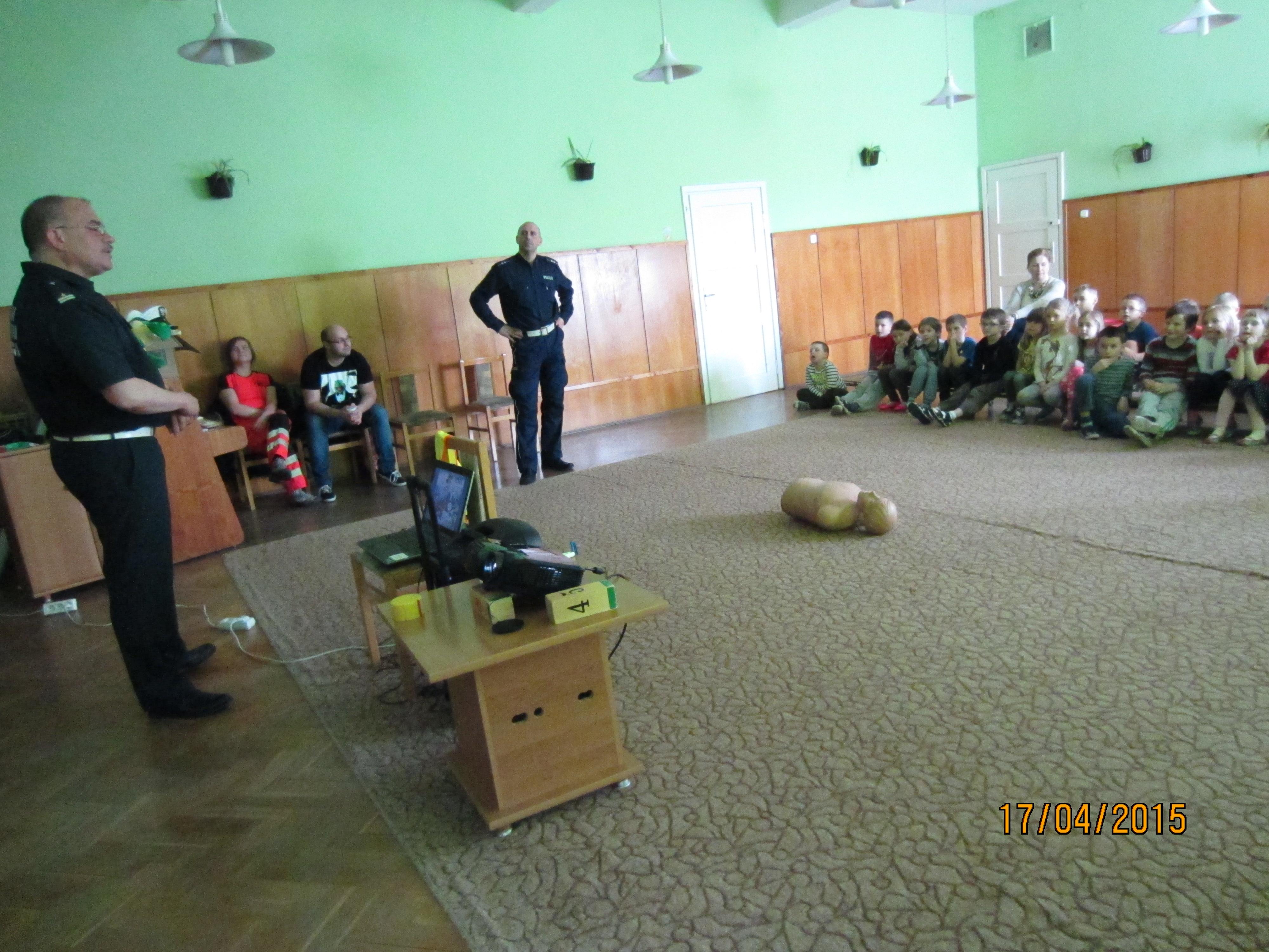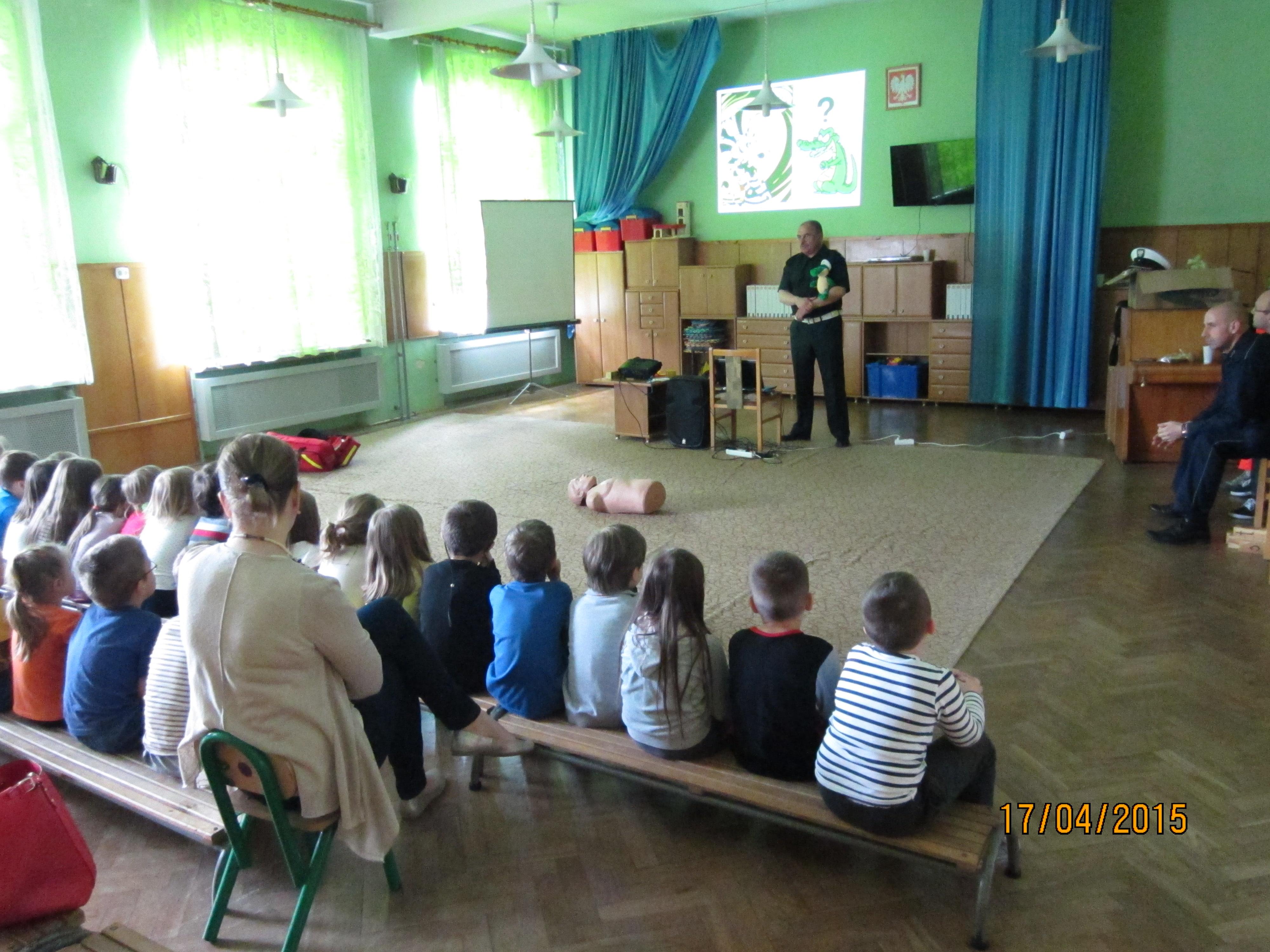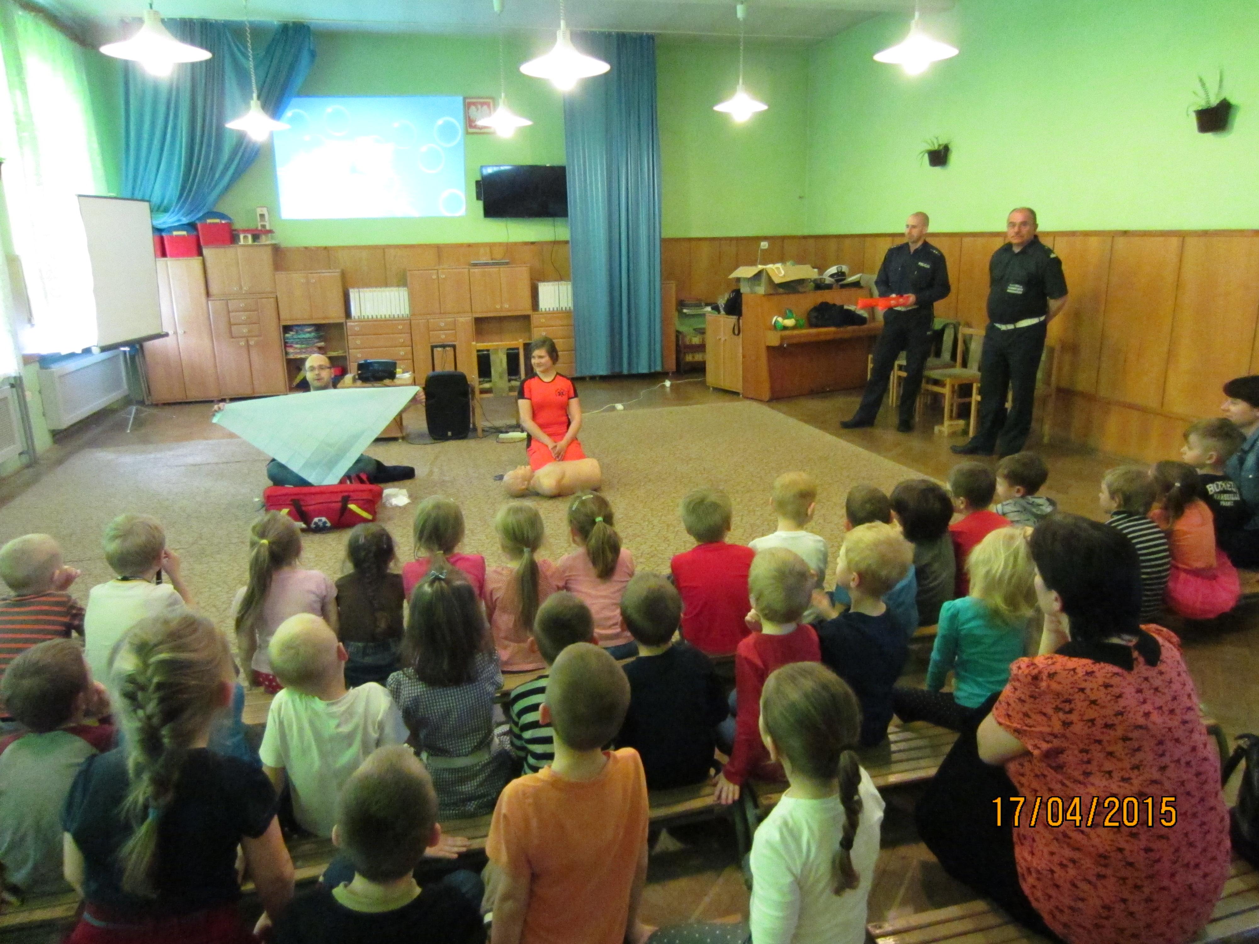 Pogadanka z dziećmi miała na celu przybliżyć pracęposzczególnych służb, które dbają o bezpieczeństwo nie tylko w ruchu drogowym, alerównież w życiu codziennym. Przedszkolaki zapoznane zostały m.in. z zasadamibezpiecznego poruszania się po drogach, przejściach dla pieszych, miejscamibezpiecznej zabawy. Ponadto wskazanezostały numery alarmowe do policji, straży pożarnej oraz pogotowia ratunkowego,a także ogólny numer ratunkowy. W pogadance zostały wykorzystane prezentacjemultimedialne, filmy animowane, makieta przejścia dla pieszych oraz fantomratowników medycznych.