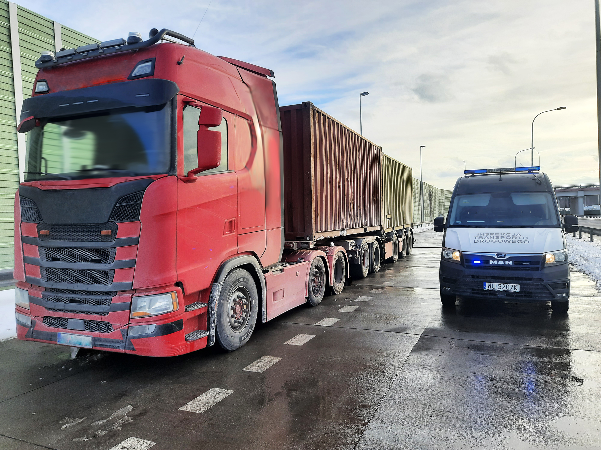 Zespół trzech zamiast dozwolonych dwóch pojazdów zatrzymali inspektorzy mazowieckiej Inspekcji Transportu Drogowego. Tonaż zestawu był znacznie przekroczony. Zestaw ważył ponad 70 t przy normie 40 t. Za duże były też naciski osi na drogę.