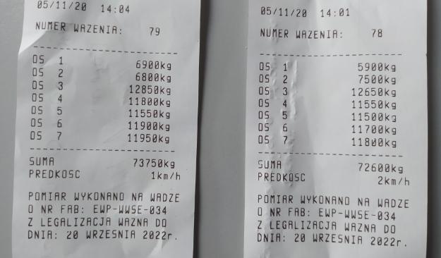 Transporty kontenerów z ładunkiem zatrzymano w czwartek (5 listopada) na krajowej "osiemdziesiątce" w Bydgoszczy. Po skierowaniu na wagę ITD okazało się, że zespoły pojazdów ważą znacznie więcej niż dopuszczalne 40 ton. Masa całkowita pierwszego wynosiła 72,60 tony. Drugi był cięższy i ważył 73,75 ton. Naciski potrójnych osi naczep zamiast dopuszczalnych 24 ton wynosiły 35 ton oraz 35,4 tony. Ponieważ ciężarówki ważyły więcej niż 60 ton, każda z nich powinna być pilotowana. "Stonogi" jechały bez pilotów, a ich kierowcy nie mieli zezwoleń na przejazd pojazdów nienormatywnych po drogach publicznych.