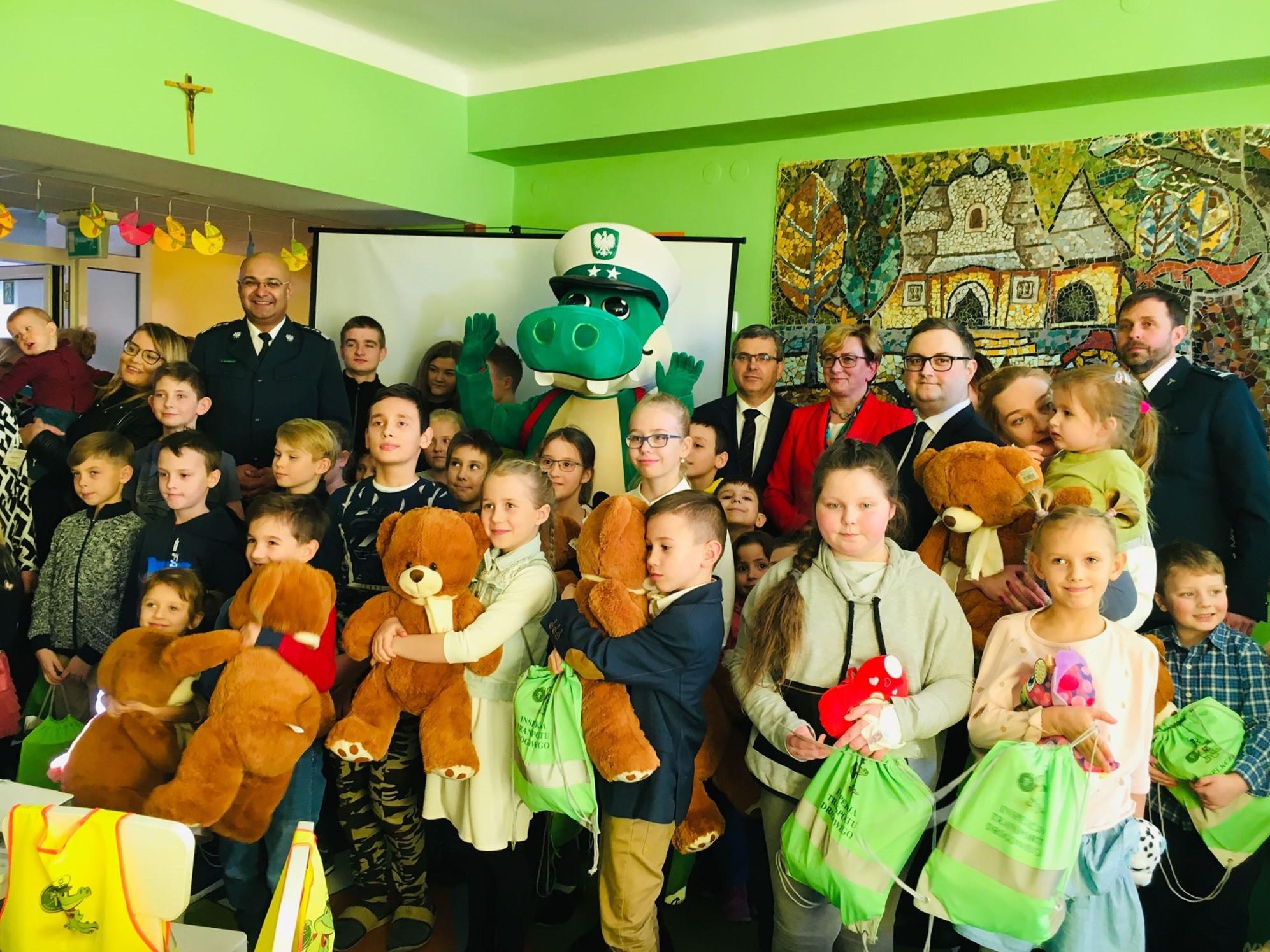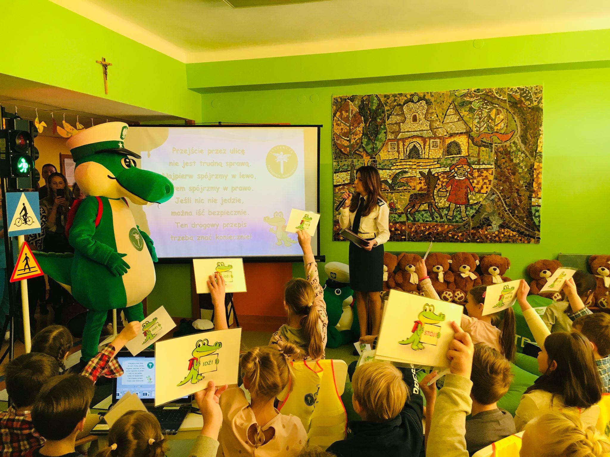 Mali pacjenci z radością uczestniczyli w spotkaniu i entuzjastycznie przyjęli wizytę Krokodylka Tirka. Na zakończenie dzieci otrzymały upominki przygotowane przez resort zdrowia i GITD, w tym zestawy elementów odblaskowych.