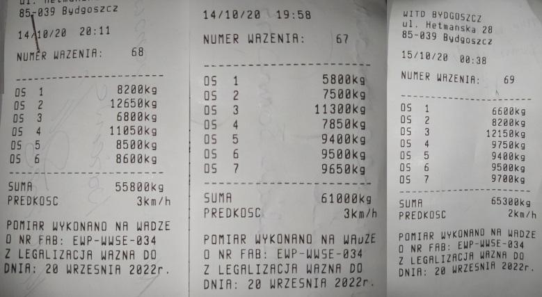 W nocy ze środy na czwartek (14-15 października) na drogach województwa kujawsko-pomorskiego funkcjonariusze ITD przeprowadzili działania, których głównym celem było wycofanie z ruchu przeładowanych pojazdów. Na wagi przenośne skierowali trzy zestawy przewożące ładunek w kontenerach. Każdy był znacznie przeciążony. Ciężarówki ważyły 65,3 tony, 61 ton oraz 55,8 tony zamiast przepisowych 40 ton. We wszystkich trzech przypadkach duże masy ładunków spowodowały również przekroczenia dopuszczalnych nacisków osi pojazdów na drogę.