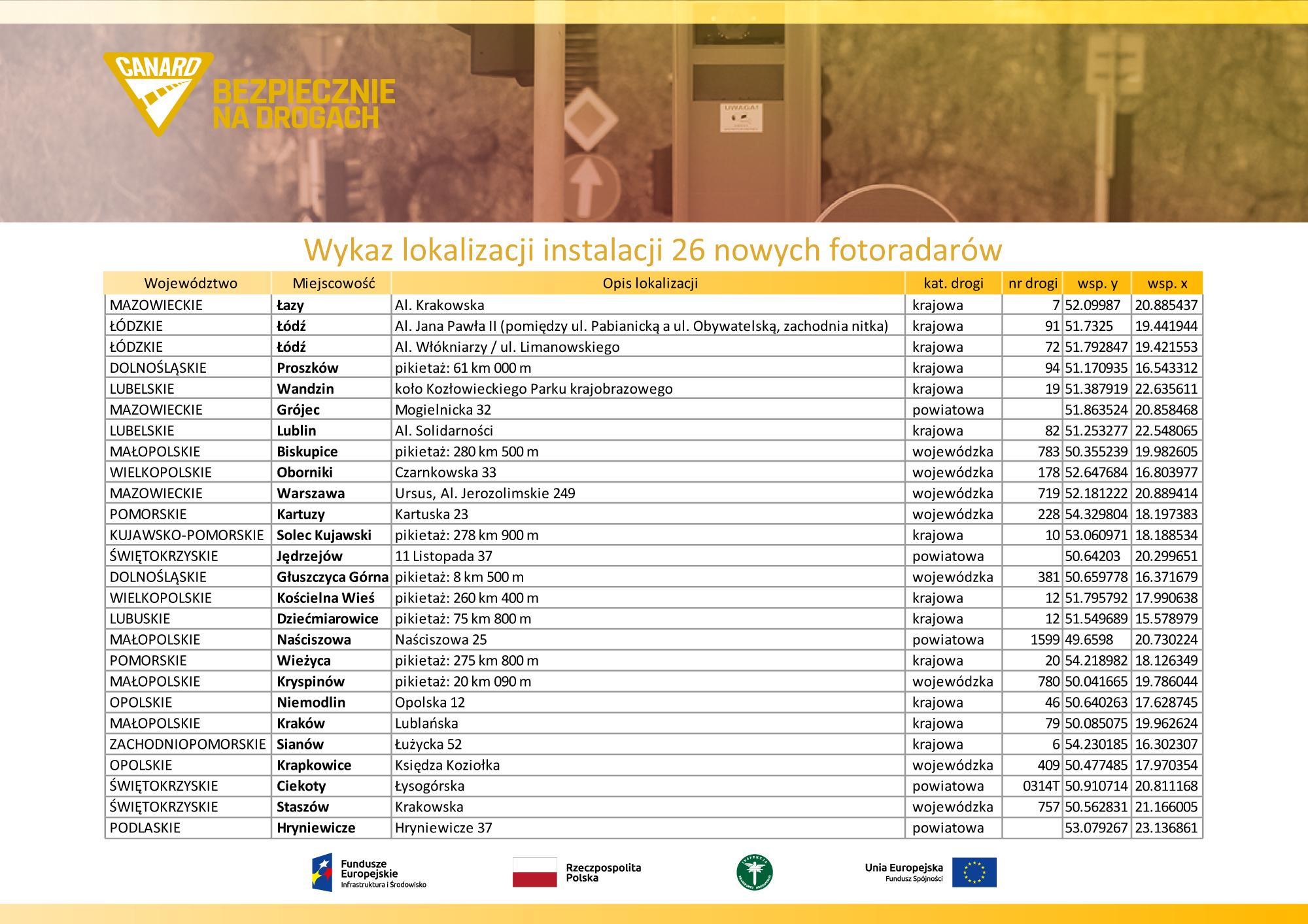 Zakup i instalacja 26 fotoradarów to pierwszy etap rozbudowy systemu fotoradarowego CANARD w ramach realizacji projektu "Zwiększenie skuteczności i efektywności systemu automatycznego nadzoru nad ruchem drogowym". Jest on współfinansowany ze środków Unii Europejskiej, w ramach Programu Operacyjnego Infrastruktura i Środowisko 2014-2020. Rozbudowa i modernizacja systemu ma wpłynąć na poprawę bezpieczeństwa ruchu drogowego. Realizacja projektu obejmie zasięgiem wszystkie kategorie dróg publicznych. Działania, zaplanowane w ramach zwiększenia skuteczności i efektywności systemu, uwzględniają włączenie do niego urządzeń najnowszej generacji.