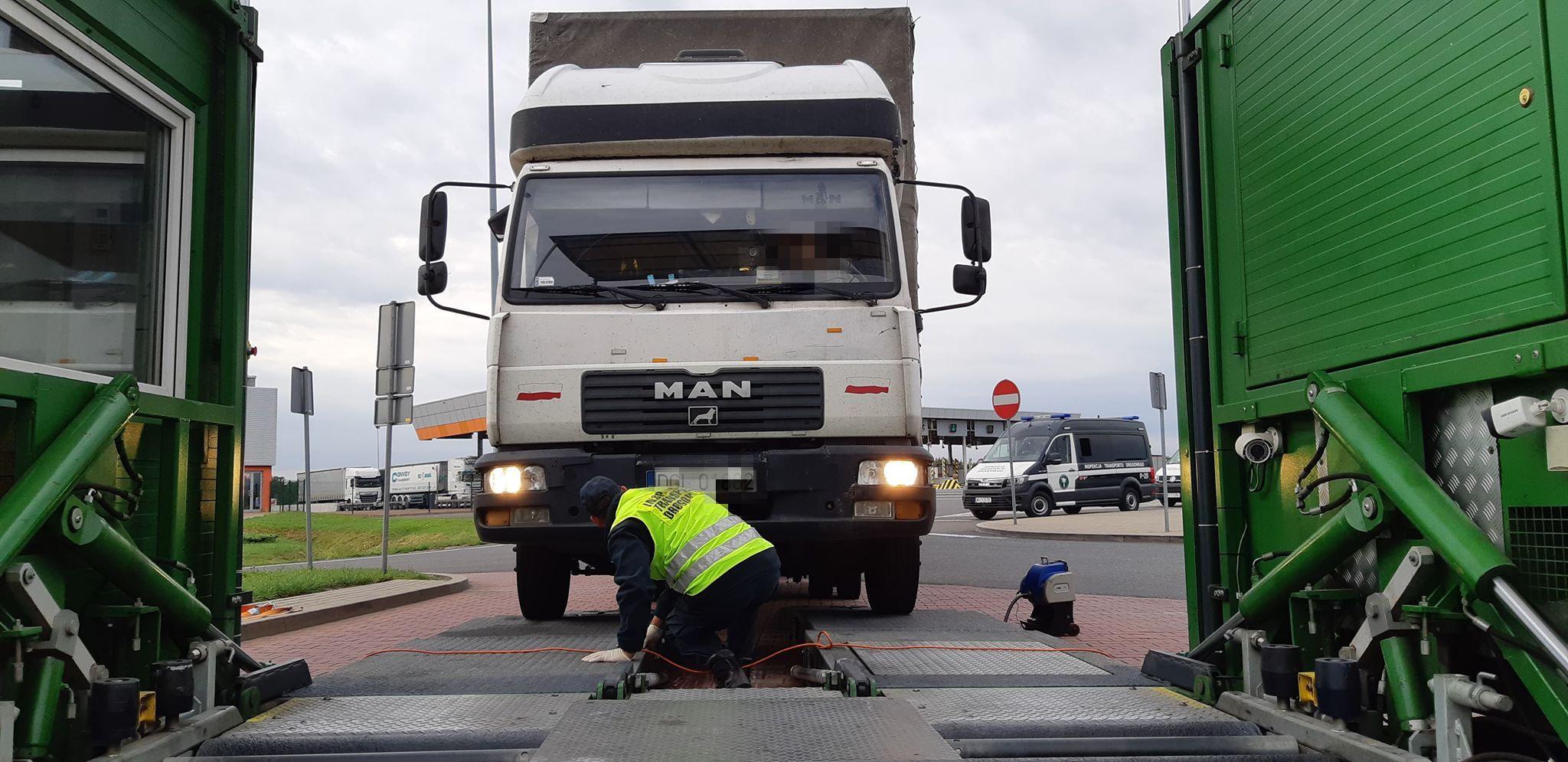 Zatrzymany na A4 kierowca przewoził styropian z Oświęcimia do Wrocławia. Do weryfikacji stanu technicznego inspektorzy wykorzystali nowoczesną, mobilną linię diagnostyczną. Kontrola ujawniła bardzo dużo nieprawidłowości - zbyt dużą różnicę sił hamowania na kołach jednej osi, niepewne mocowanie nadwozia, niesprawny tachograf oraz liczne usterki oświetlenia. Stan przyczepy sprzęgniętej z kontrolowanym samochodem ciężarowym pozostawiał również wiele do życzenia. Inspektorzy stwierdzili skrajnie zużyte ogumienie pojazdu, pęknięty klosz lampy oraz uszkodzenie zaworu sterowania poduszką zawieszenia, którą kierujący postanowił naprawić w oryginalny sposób - za pomocą długopisu.