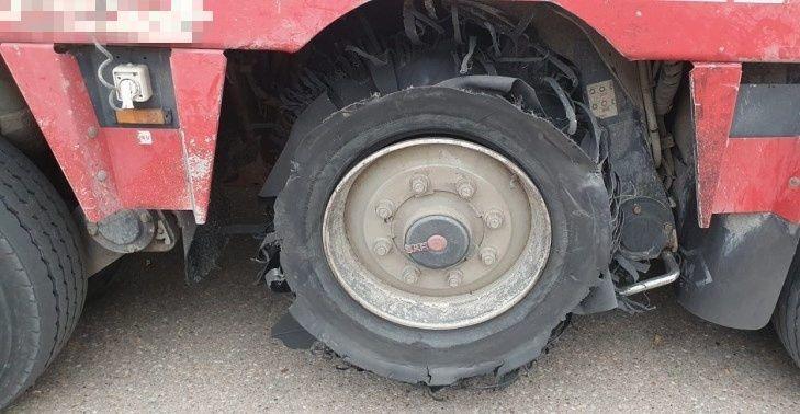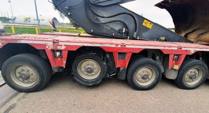 Naczepą ze zniszczoną po wystrzale oponą na przedostatniej osi przewoził koparkę kierowca zestawu zatrzymanego przez funkcjonariuszy podlaskiej Inspekcji Transportu Drogowego. Kierujący okazał inspektorom zezwolenie uprawniające do przejazdu pojazdu nienormatywnego o masie całkowitej do 60 ton. Tymczasem ciężarówka z przewożonym ładunkiem ważyła ponad 67 ton. Nieprawidłowy transport skierowano na wyznaczony parking strzeżony.