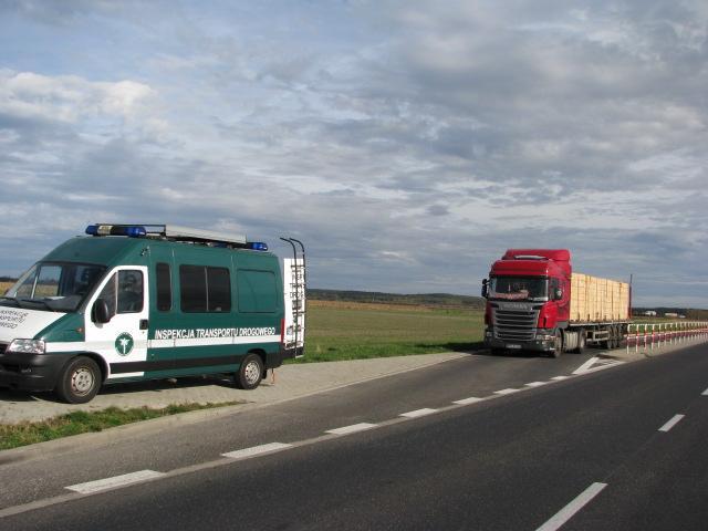 Podczas dojazdu do punktu kontrolnego w Lesznie uwagę inspektorów z Wielkopolskiego WITD zwrócił pojazd członowy poruszający się po drodze krajowej nr 5, którym wykonywany był przewóz na potrzeby własne tarcicy załadowanej na terenie Małopolski. Pojazd zatrzymano celem dokonania pomiarów normatywności. Podejrzenia inspektorów się potwierdziły. Stwierdzono rażące przekroczenie dopuszczalnej masy całkowitej pojazdu, która wyniosła ponad 47 ton. Tak ciężki ładunek spowodował w konsekwencji również rażące przekroczenie dopuszczalnego nacisku osi napędowej na drogę - ponad 14 ton. Skrajne nieprawidłowości stwierdzono również po przeanalizowaniu danych z karty kierowcy i tachografu cyfrowego. Ustalono, że kierowca nagminnie prowadzi pojazd z kartą wyjętą z tachografu i w okresie podlegającym kontroli wielokrotnie skracał odpoczynki dobowe o nawet 5 godzin. O skali naruszeń świadczy fakt, że suma kar za przekroczenia z czasu pracy przekracza 30.000 zł. Ustalono także, że kierowca wynagradzany jest przede wszystkim za liczbę przejechanych kilometrów, czego zabraniają przepisy. W związku ze stwierdzonymi naruszeniami wszczęto postępowania administracyjne wobec przewoźnika, a kierowcę ukarano mandatem karnym. Pojazd unieruchomiono do czasu rozładowania części ładunku.