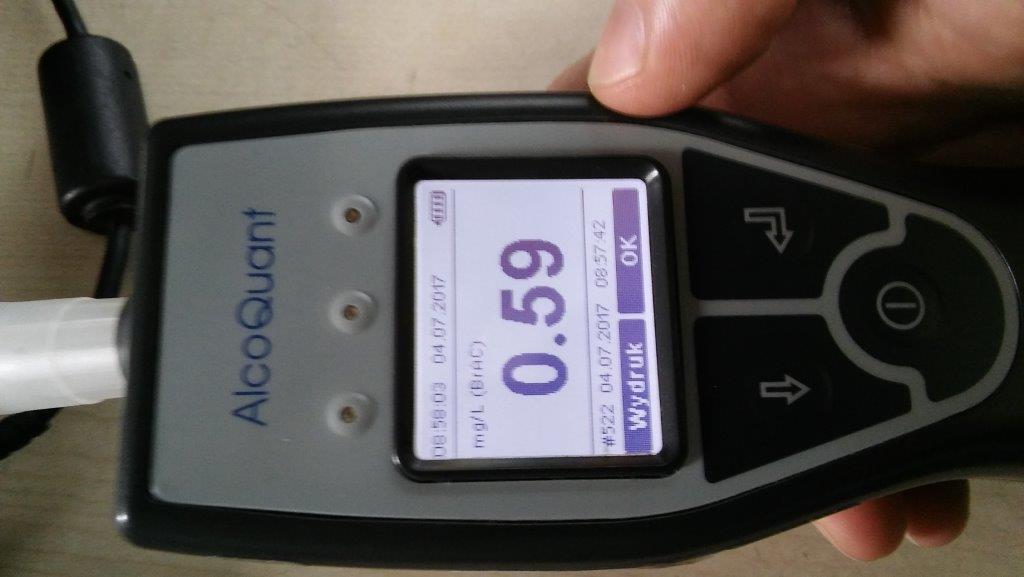We wtorek, 4 lipca 2017 r. inspektorzy z WITD w Katowicach w Siewierzu zatrzymali do kontroli drogowej zespół pojazdów litewskiego przewoźnika. Po zatrzymaniu kierowca wysiadł z pojazdu z dokumentami w celu kontroli. Po poleceniu przez inspektorów powrotu do kabiny ciężarówki, kierowca użył mocnego odświeżacza powietrza i usiadł na fotelu pasażera. Zachowanie mężczyzny wzbudziło podejrzenia inspektorów co do jego stanu trzeźwości. Zwłaszcza, że pomimo intensywnego zapachu odświeżacza, wyczuwalna była woń spożywanego alkoholu. Po pobraniu dokumentów do kontroli, już w radiowozie, kierowca został poddany dwukrotnemu badaniu na zawartość alkoholu. Wyniki to 0,59 mg/l (1,2 promila) i po 15 minutach - 0.58 mg/l.