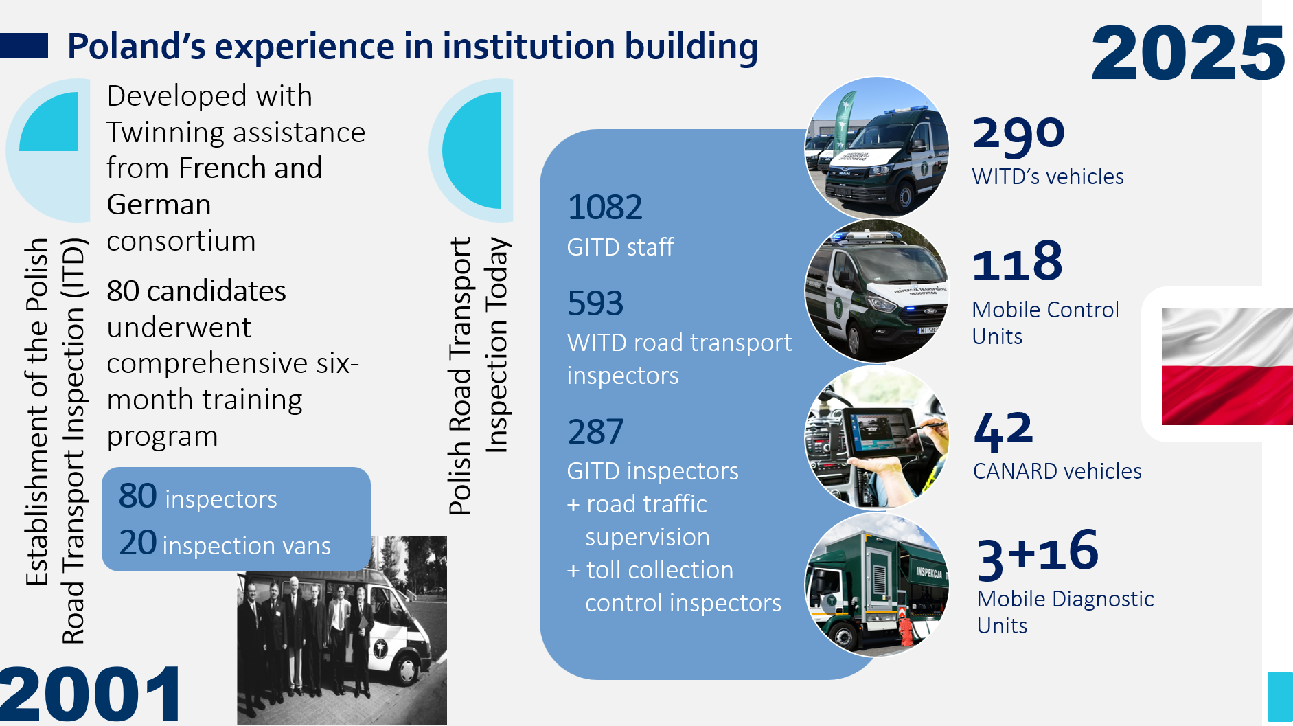 Wśród polskich instytucji silną pozycję w programach Twinning i TAIEX zajmuje Główny Inspektorat Transportu Drogowego. Dzięki kompetencjom w obszarze czasu pracy kierowców, transportu towarów niebezpiecznych (ADR), przeprowadzania kontroli drogowych i egzekwowania przepisów, GITD stał się kluczowym partnerem w projektach mających na celu usprawnienie systemów kontroli i inspekcji drogowych w innych krajach.