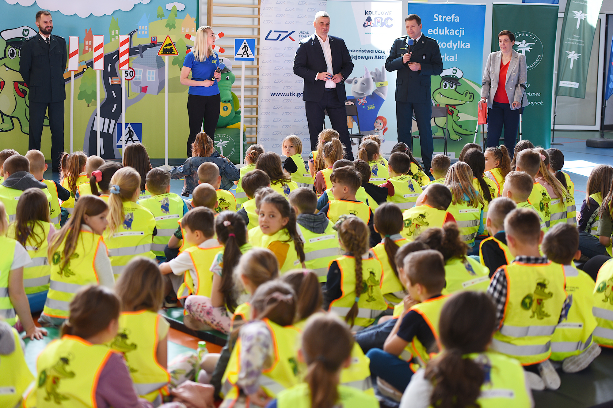 – Dziś spotykamy się wspólnie z UTK, aby przypomnieć najmłodszym najważniejsze zasady bezpiecznego poruszania się po drogach, ale również o tym, jak bezpiecznie korzystać z obszarów kolejowych. Za kilka tygodni rozpoczynają się wakacje, czas na który czekają wszyscy uczniowie. Aby był bezpieczny, już dziś warto przypomnieć sobie, jakich zasad przestrzegać na rowerowych wycieczkach, dlaczego niebezpieczna jest zabawa w pobliżu drogi i jak zachować się w podróży, czy to autokarem czy pociągiem. W czasie podróży pamiętajmy o zapinaniu pasów. Jesteście dziś w pięknych kamizelkach odblaskowych. To ważne aby je zakładać, bo dzięki temu jesteśmy bardziej widoczni na drogach – mówił do dzieci p.o. zastępca Głównego Inspektora Transportu Drogowego Michał Mostowski.