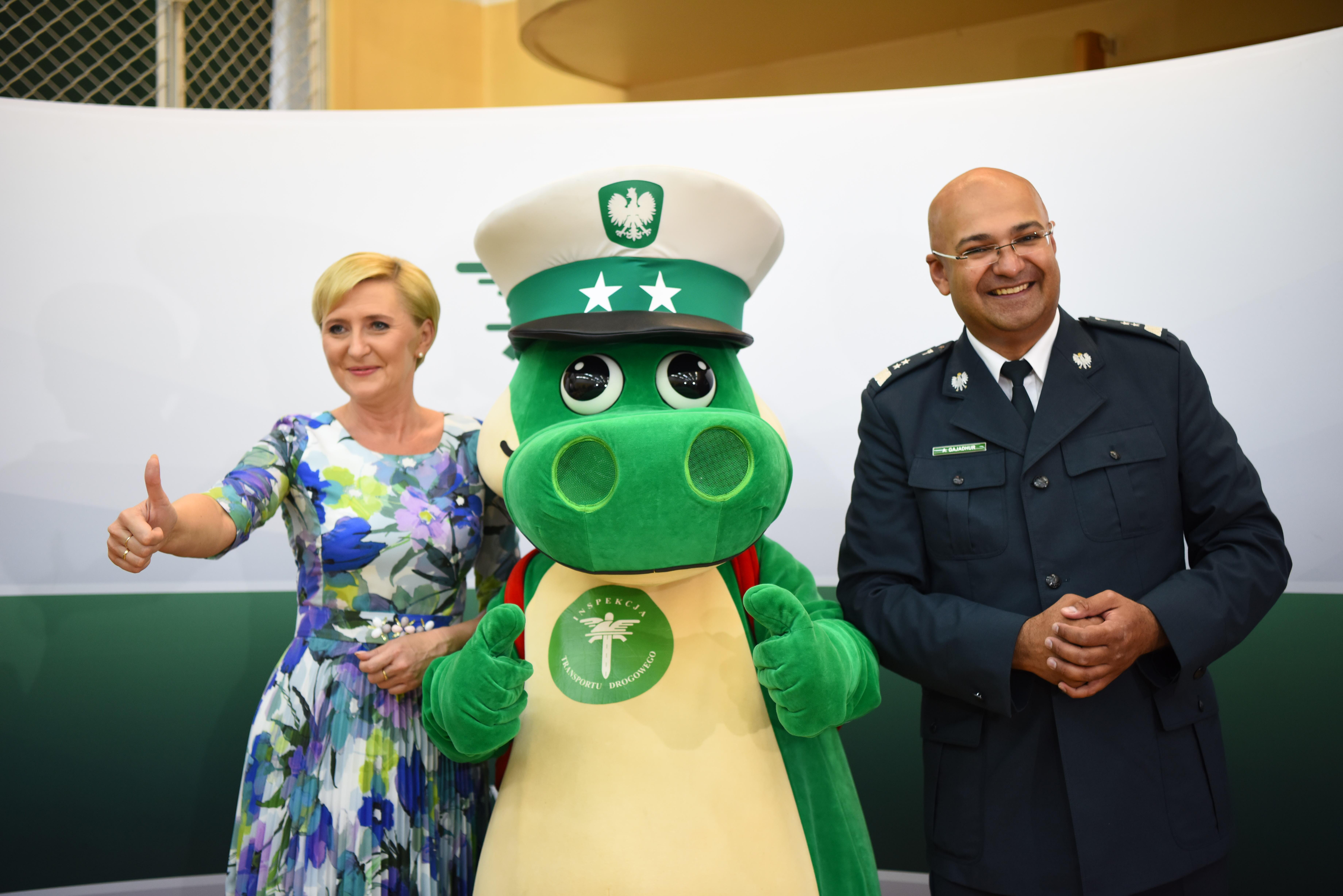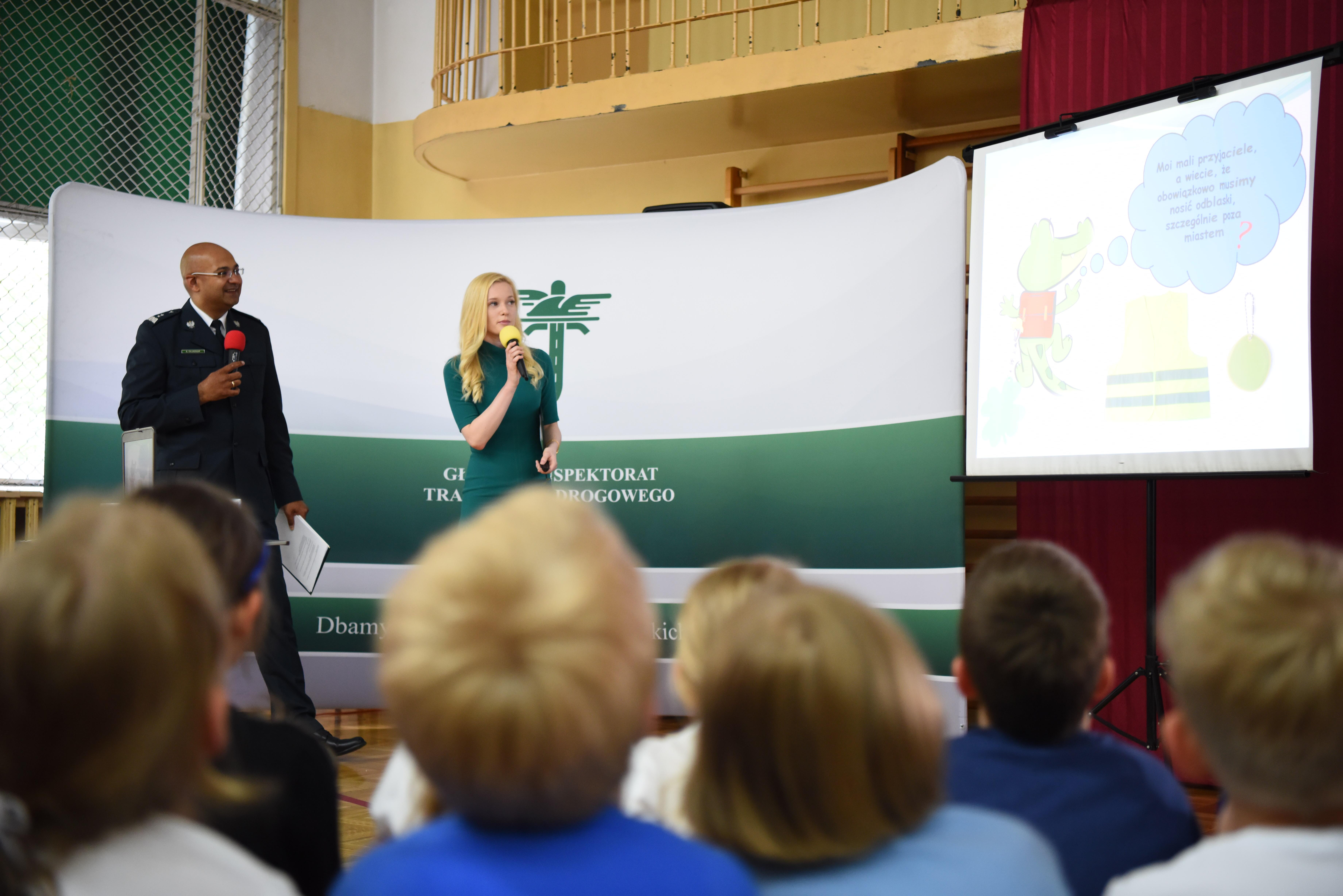 Główny Inspektor Transportu Drogowego Alvin Gajadhur wspólnie z Dyrektor Gabinetu Głównego Inspektora Urszulą Nowinowską poprowadzili animowaną prezentację, gdzie na podstawie przygód Krokodylka Tirka i jego przyjaciół opowiadali, jak na co dzień unikać zagrożeń na drodze.