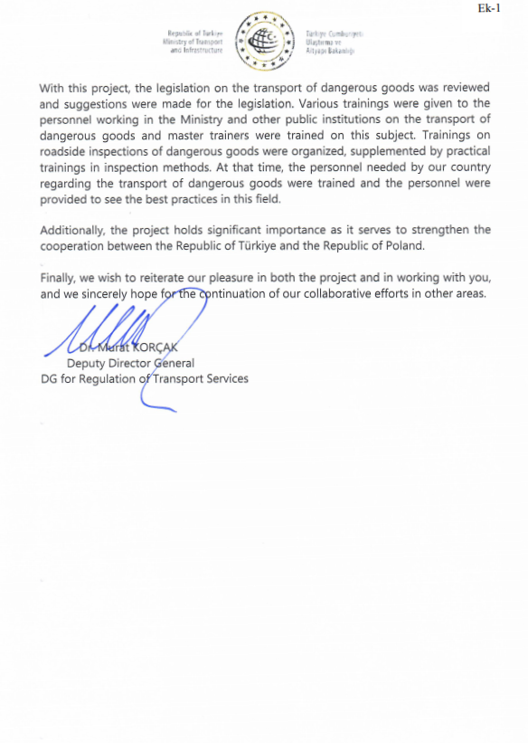 Podkreślił również, że przebieg projektu był niezwykle płynny, a atmosfera pracy sprzyjała efektywności. W ramach projektu dokonano przeglądu przepisów dotyczących transportu towarów niebezpiecznych oraz zaproponowano zmiany legislacyjne. Przeprowadzono szkolenia dla pracowników Ministerstwa i innych instytucji publicznych, przygotowując ich do działań w dziedzinie transportu towarów niebezpiecznych jak również umożliwiając dalsze dzielenie się zdobytą wiedzą, a także zorganizowano praktyczne szkolenia z zakresu inspekcji drogowych.