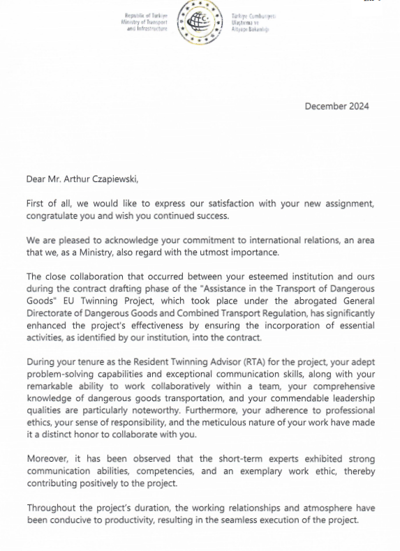 Dr. Murat Korçak - Zastępca Dyrektora Generalnego Generalnej Dyrekcji ds. Regulacji i Usług Transportowych Republiki Turcji zaznaczył, że rola Artura Czapiewskiego jako Długoterminowego Doradcy Współpracy Bliźniaczej (RTA) była szczególnie istotna, a zdolności rozwiązywania problemów, wyjątkowe umiejętności komunikacyjne, szeroka wiedza w zakresie transportu towarów niebezpiecznych oraz kwalifikacje menadżerskie i umiejętność pracy zespołowej, zasługują na najwyższe uznanie.