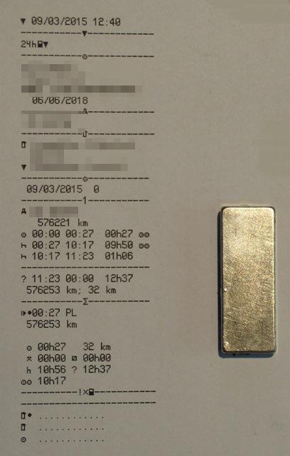 W wyniku analizy danych pobranych z tachografu cyfrowego oraz z karty kierowcy ustalono, że w okresie niespełna godziny przed zatrzymaniem pojazdu do kontroli tachograf rejestrował postój pojazdu i odpoczynek kierowcy. W związku z tym dokonano oględzin pojazdu podczas, których stwierdzono przymocowany do nadajnika impulsów znajdującego się przy skrzyni biegów magnes zakłócający pracę tachografu.