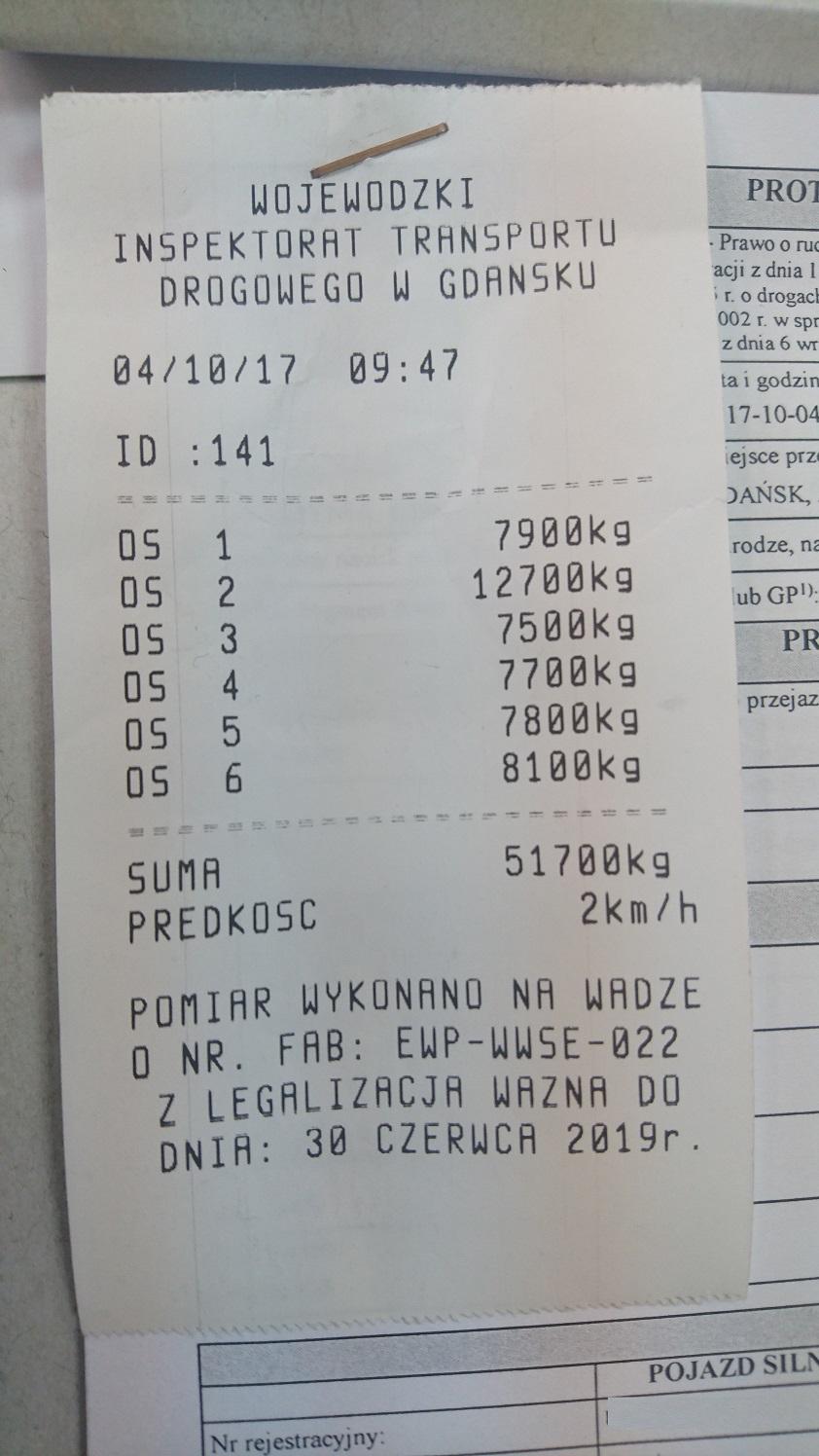 Sprawdzenie tabliczki znamionowej na opakowaniu skrzyni biegów potwierdziło przypuszczenia inspektorów, że jest to ładunek nienormatywny. Tymczasem kierujący nie posiadał odpowiedniego zezwolenia na tego typu przewóz. Masa netto ładunku wynosiła 32 tony. Inspektorzy skierowali pojazd na punkt wagowy w Gdańsku, gdzie został zważony i zmierzony. Okazało się, że rzeczywista masa całkowita wraz z ładunkiem wynosiła 51,7 tony - przekroczenie o 11,7 tony, tj. blisko o 30 procent. Stwierdzono również przekroczenie nacisku na podwójną oś napędową. Kierujący twierdził, iż został zapewniony przez norweskiego przedsiębiorcę, że taki przejazd w Polsce nie wymaga żadnego zezwolenia.