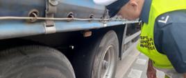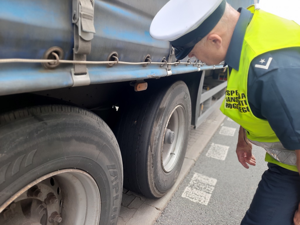 Już na wstępie kontroli stanu technicznego, inspektorzy zwrócili uwagę na ogumienie przy naczepie. Opony po obu stronach na pierwszej osi pojazdu, były mocno spękane i występowały w nich liczne ubytki bieżnika. Niektóre ubytki były tak duże, że odsłaniały stalowy kord opon. Ogumienie w takim stanie wymagało natychmiastowej wymiany, ponieważ groziło „wystrzałem”.