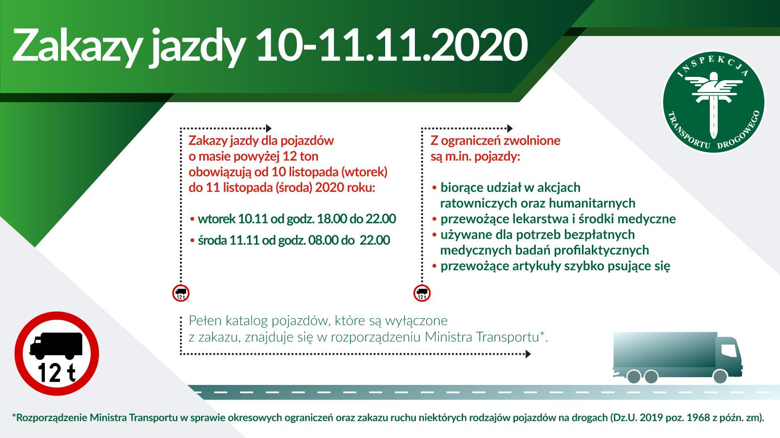 Inspekcja Transportu Drogowego przypomina, że 10 oraz 11 listopada będą obowiązywały ograniczenia i zakazy ruchu dla pojazdów i zespołów pojazdów o dopuszczalnej masie całkowitej przekraczającej 12 ton, z wyłączeniem autobusów.