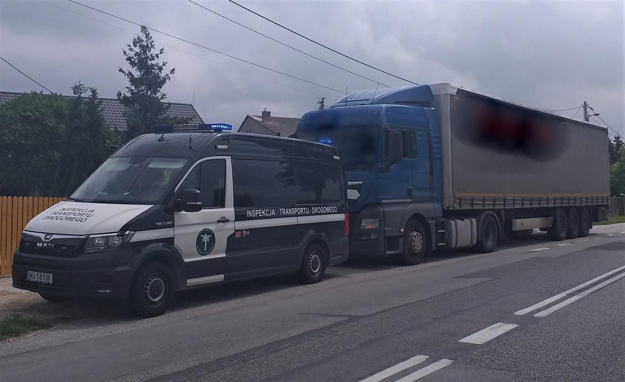 Inspektorzy ukarali kierowcę ciężarówki mandatem. Wobec jego pracodawcy zostało wszczęte postępowanie administracyjne. Grozi mu kara pieniężna.