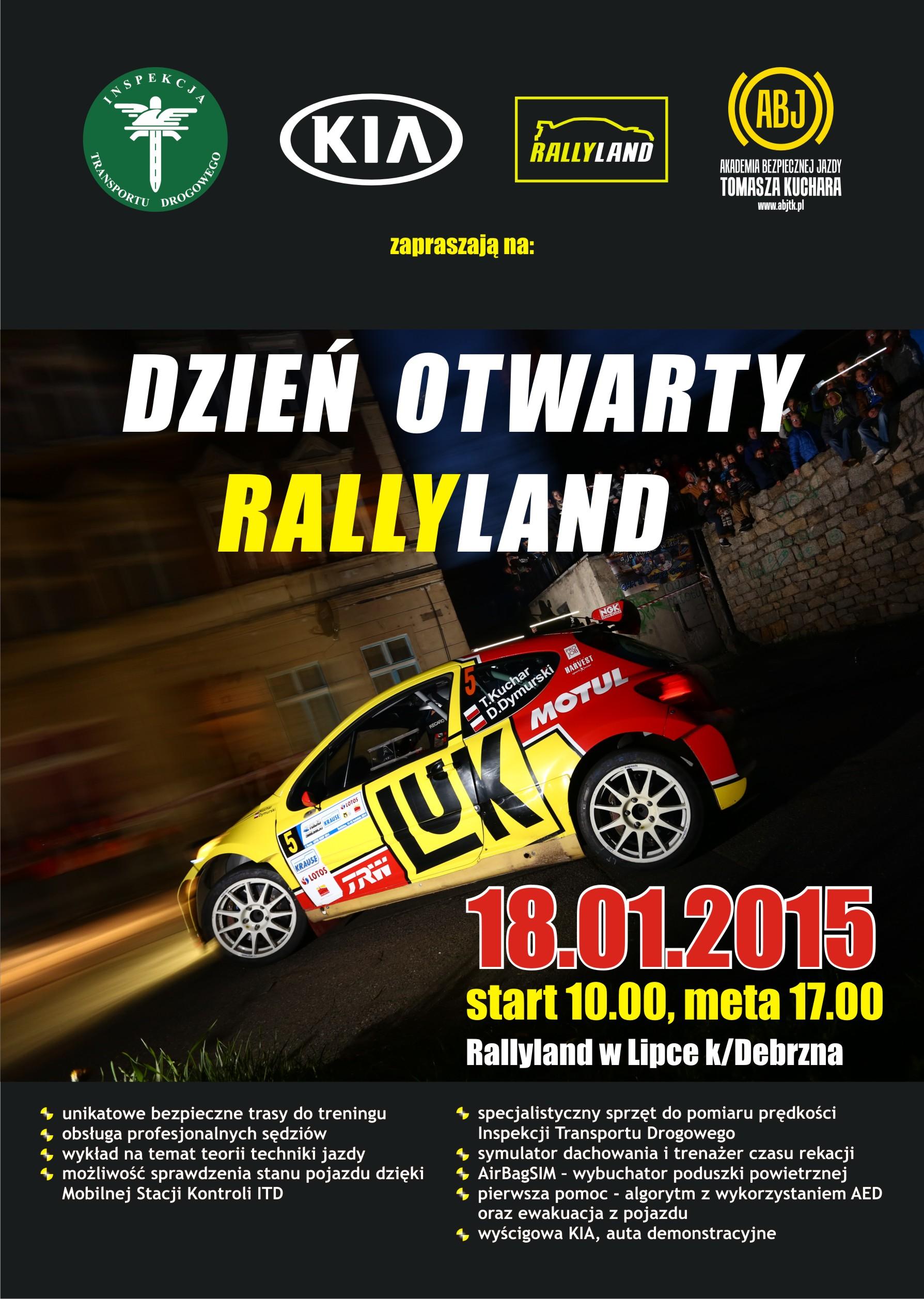 Główny InspektoratTransportu Drogowego, Akademia Bezpiecznej Jazdy Tomasza Kuchara oraz KiaMotors Polska mają przyjemność zaprosić do udziału w drugiej edycji "Dnia Otwartego Rallyland" , któraodbędzie się 18 stycznia 2015 roku wośrodku szkoleniowym Rallyland zlokalizowanym w miejscowości Lipka k/Debrzna wwoj. wielkopolskim. Inicjatywa ta skierowana jest do wszystkich miłośnikówsportów motorowych, a zwłaszcza tych, którzy nie mają świadomości, że w Polsceistnieją miejsca, w których można bezpiecznie trenować i rywalizować niestwarzając zagrożenia dla innych użytkowników publicznych dróg.
