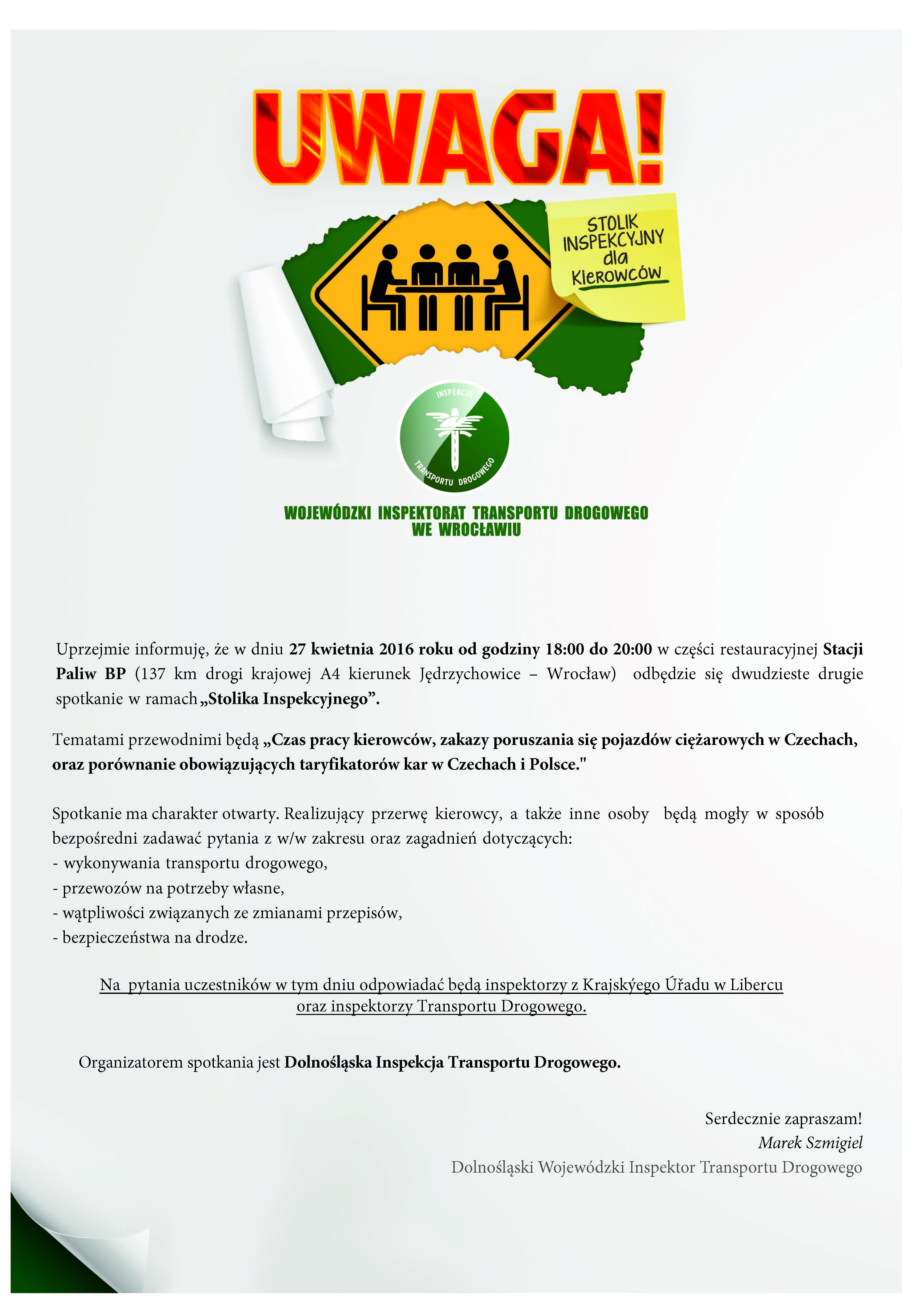 Uprzejmie informujemy, że w dniu 27 kwietnia 2016 roku od godziny 18:00 do 20:00 w części restauracyjnej Stacji Paliw BP (137 km drogi krajowej A4 kierunek Jędrzychowice - Wrocław) odbędzie się dwudzieste drugie spotkanie w ramach "Stolika Inspekcyjnego". Tematami przewodnimi będą "Czas pracy kierowców, zakazy poruszania się pojazdów ciężarowych w Czechach oraz porównanie obowiązujących taryfikatorów kar w Czechach i Polsce."