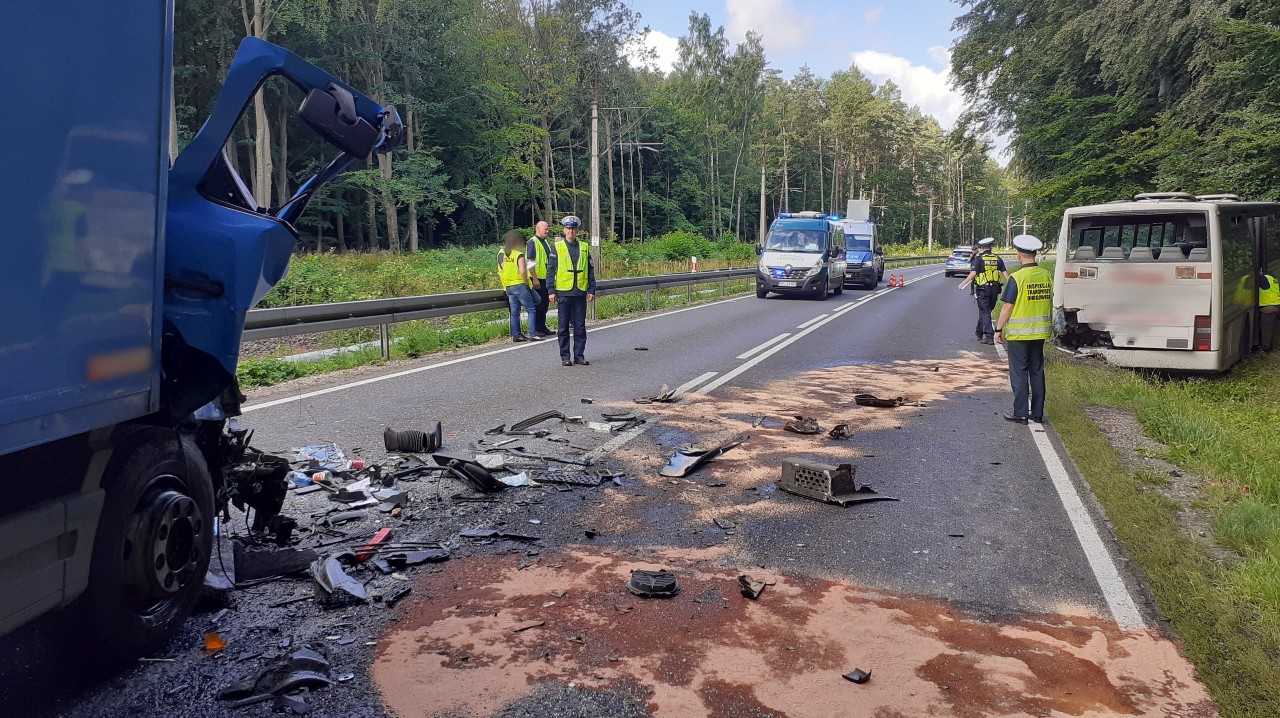 Samochód ciężarowy uderzył w tył autobusu z pasażerami na krajowej „jedenastce”, w okolicach Kołobrzegu. Kierujący solówką był pijany – miał 2 promile alkoholu w wydychanym powietrzu. Na miejscu wypadku byli funkcjonariusze zachodniopomorskiej Inspekcji Transportu Drogowego.