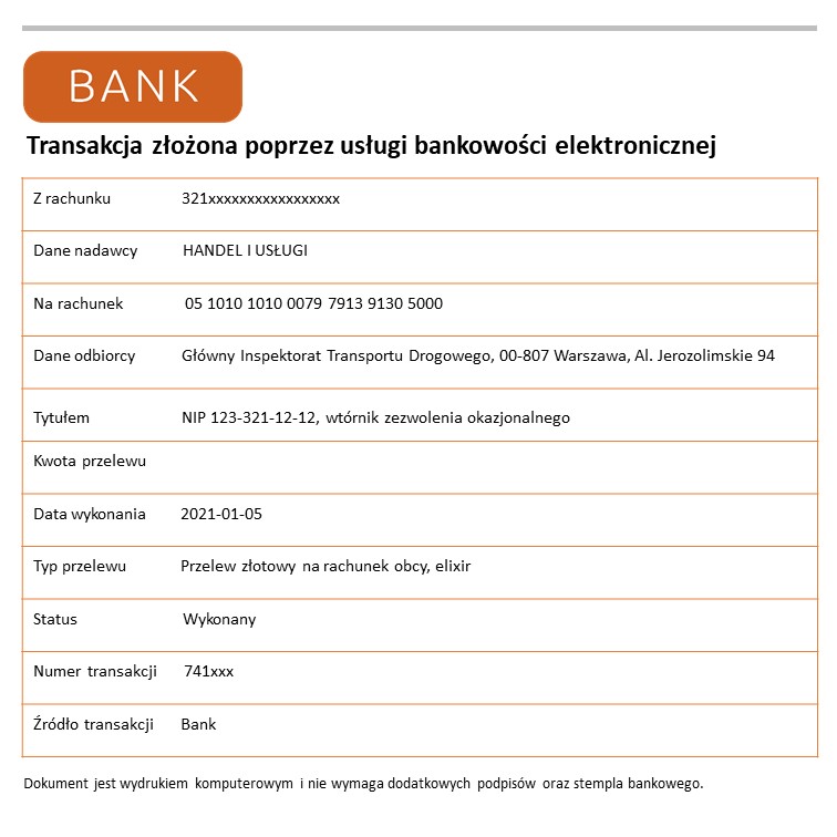 W tytule przelewu należy bezwzględnie podać numer NIP i wskazać czego dot. opłata: zezwolenie okazjonalne.