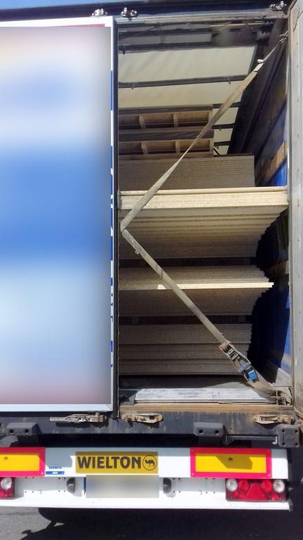 Podczas kontroli ujawniono, że w trakcie transportu nieprawidłowo zabezpieczony ładunek, znacznie się przemieścił. Płyty napierały na drzwi naczepy, co stwarzało niebezpieczeństwo ich rozsypania i wypadnięcia na drogę w trakcie jazdy.